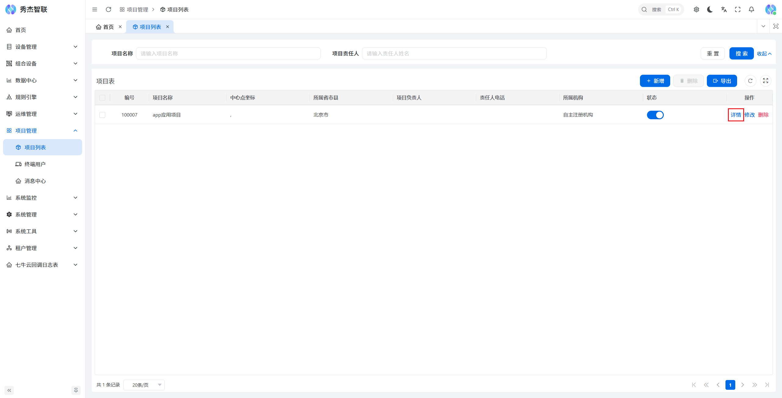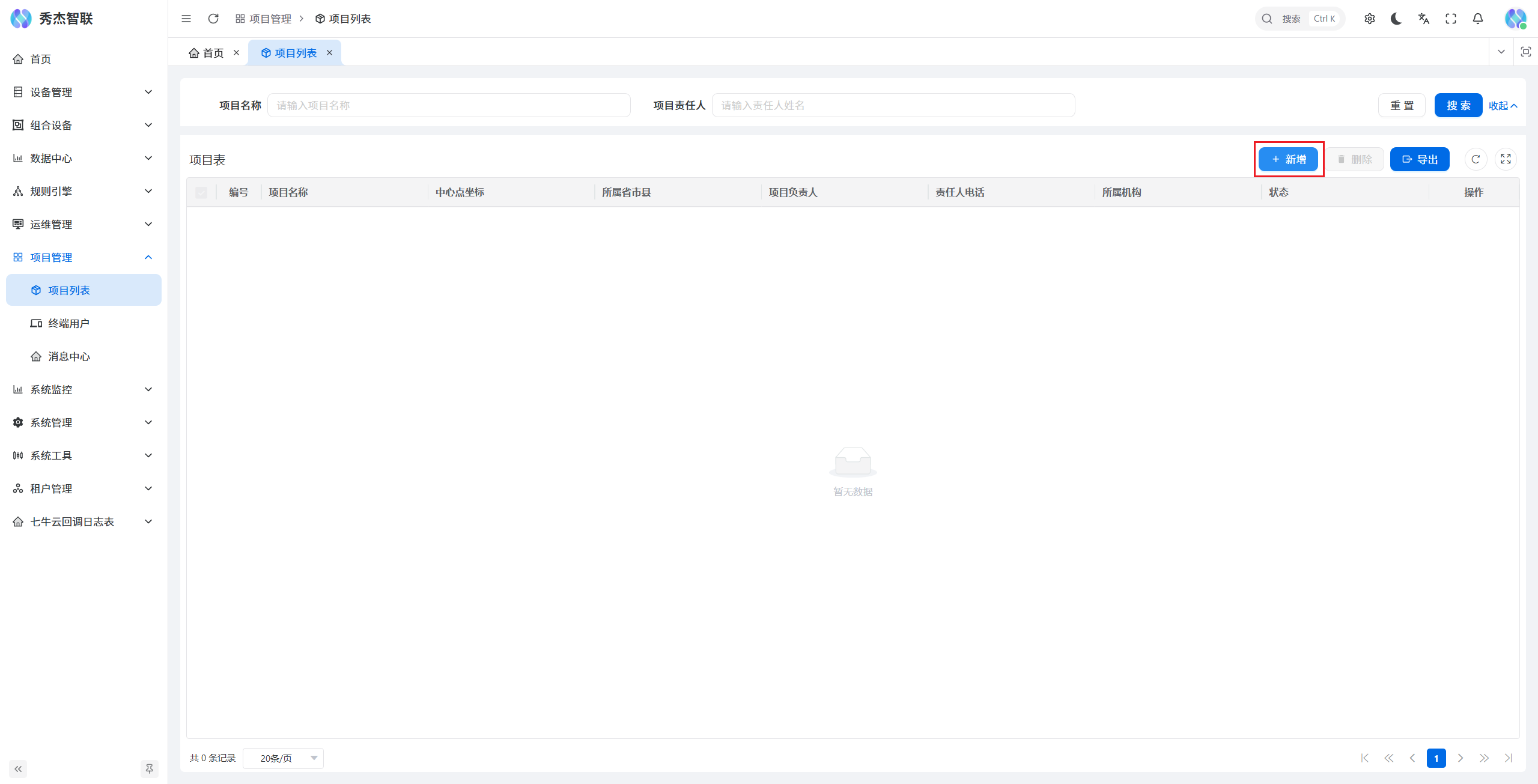 在JieIOT平台,进入项目管理页面,点击项目列表,即可看到项目表页面,点击新增按钮,即可创建您的项目。