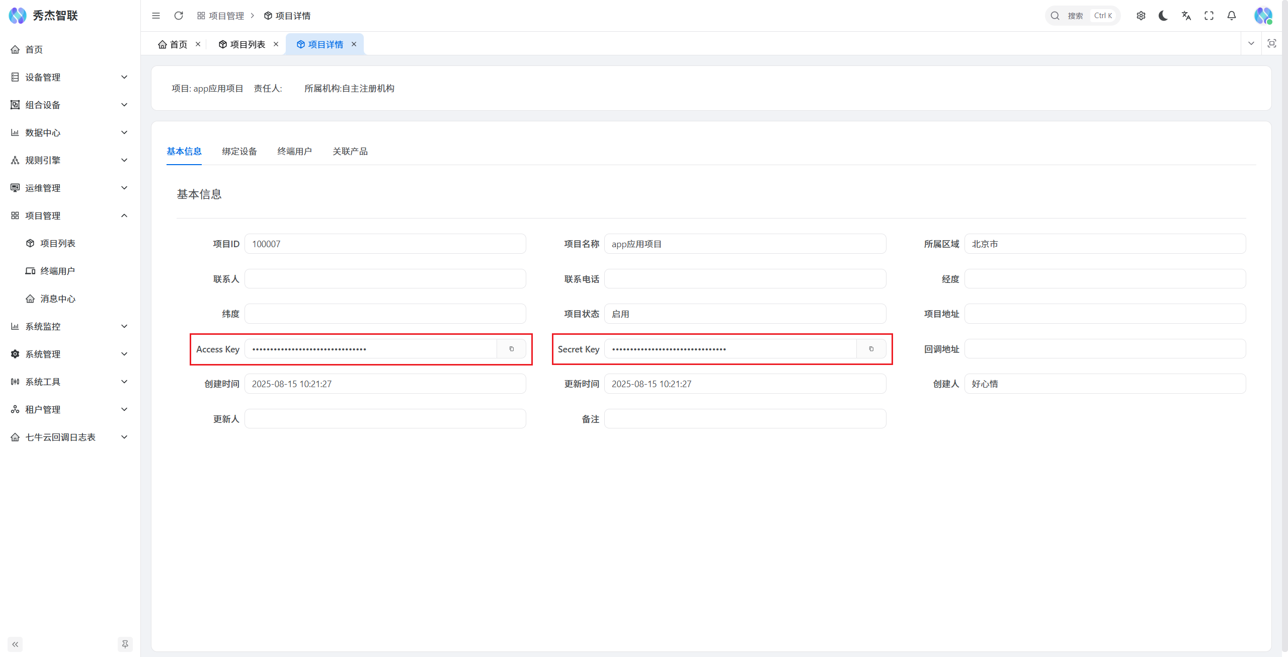 在项目详情页面->基本信息部分,可获得项目的 ProjectID 和 API Key。点击 Access Key 和 Secret Key右侧的复制按钮,即可获取。