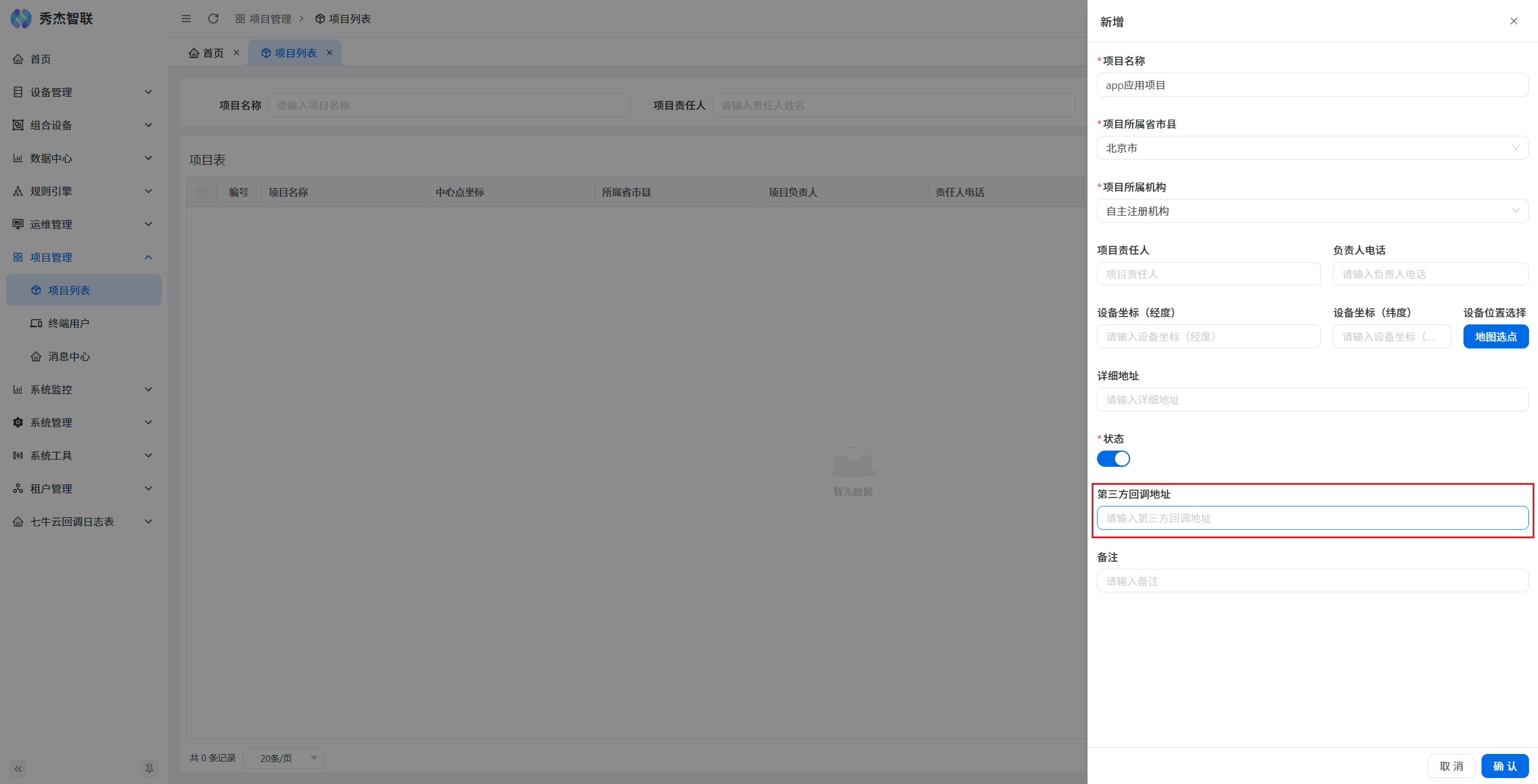 在项目新增页面,填写项目信息,并点击确认按钮,即可创建项目。这里的项目信息您可以在操作栏->修改中随时修改