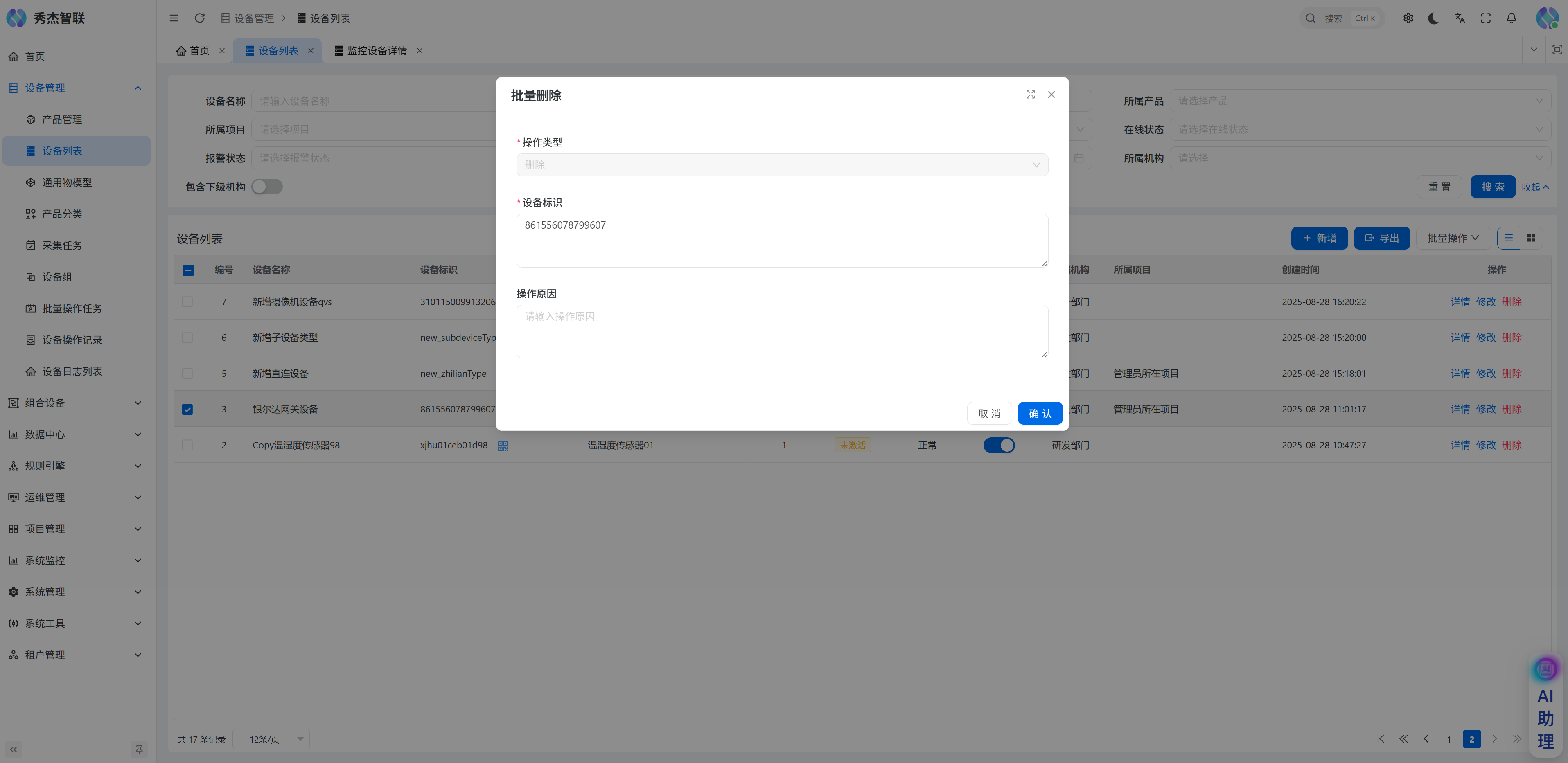 在设备列表中勾选需要删除的设备,点击“批量删除”按钮,回填"设备标识"后,可检查设备标识号,确认无误后,可删除设备。之后可以在设备操作记录中查看结果。