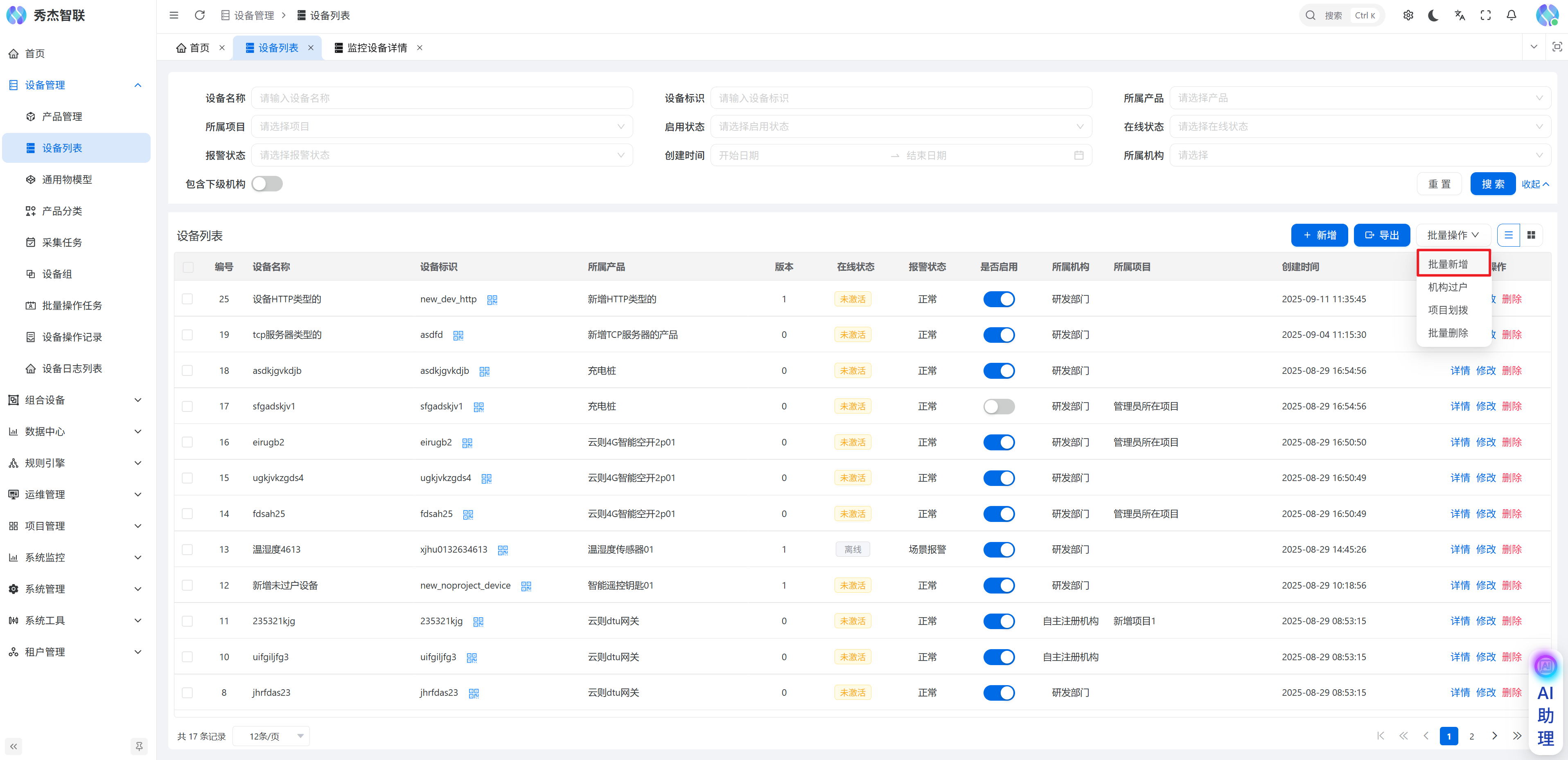 批量操作设备,在设备管理->设备列表页面中,表格上方有一个“批量操作”的下拉框,这个里面可以选择“批量操作”的类型,对这些设备进行处理。