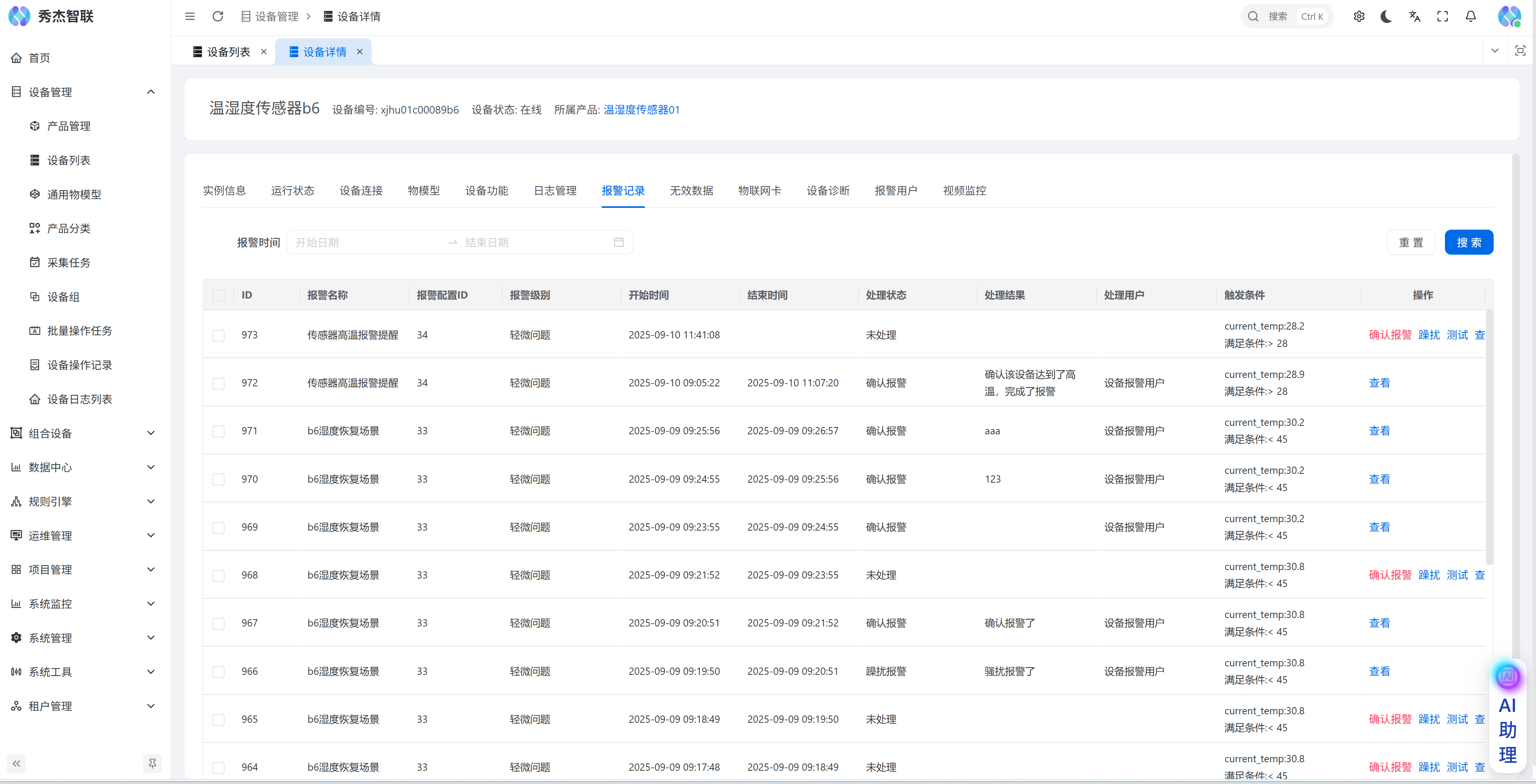 设备详情--报警记录,查看设备报警记录,并对报警记录进行处理(确认报警,噪扰报警,测试报警等,查看报警记录处理信息)