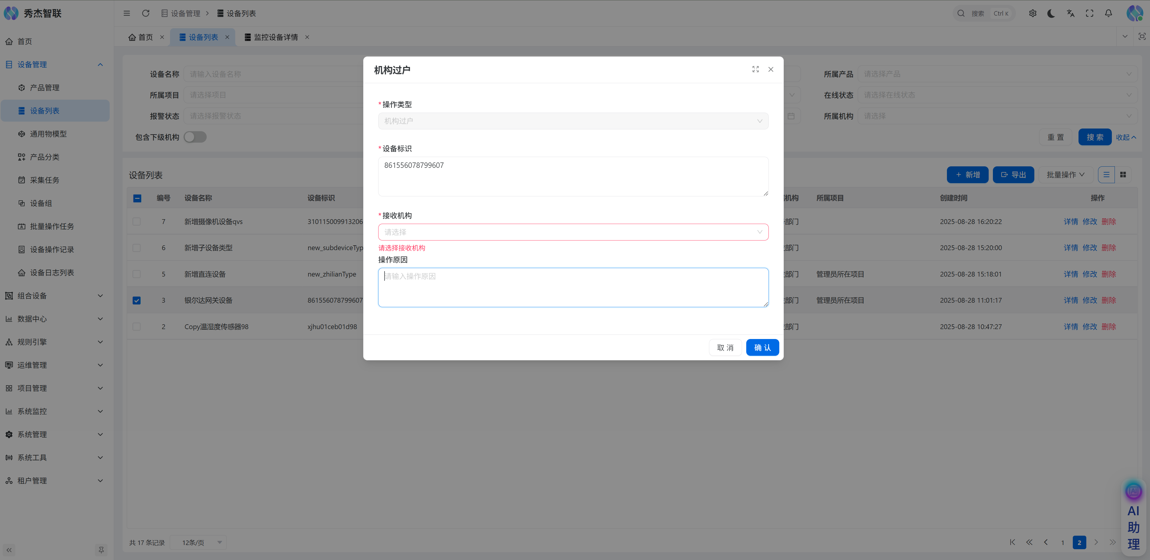 在设备列表中勾选需要机构过户的设备,勾选好之后点击“机构过户”,会自动将设备标识回填到机构过户表格中,选择要过户的机构即可,可以在设备操作记录中查看结果。