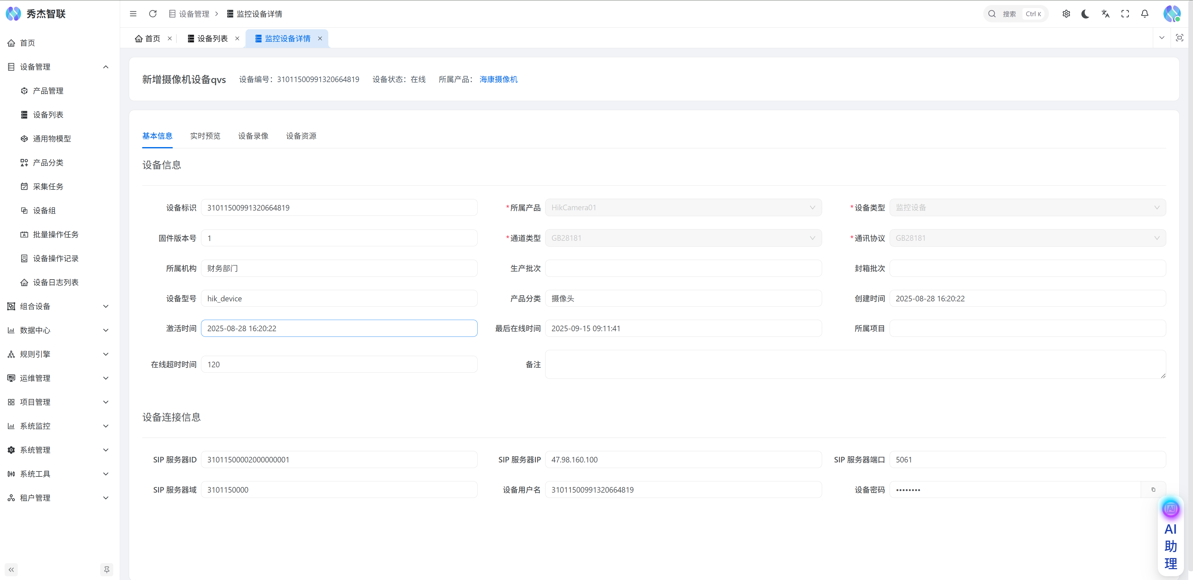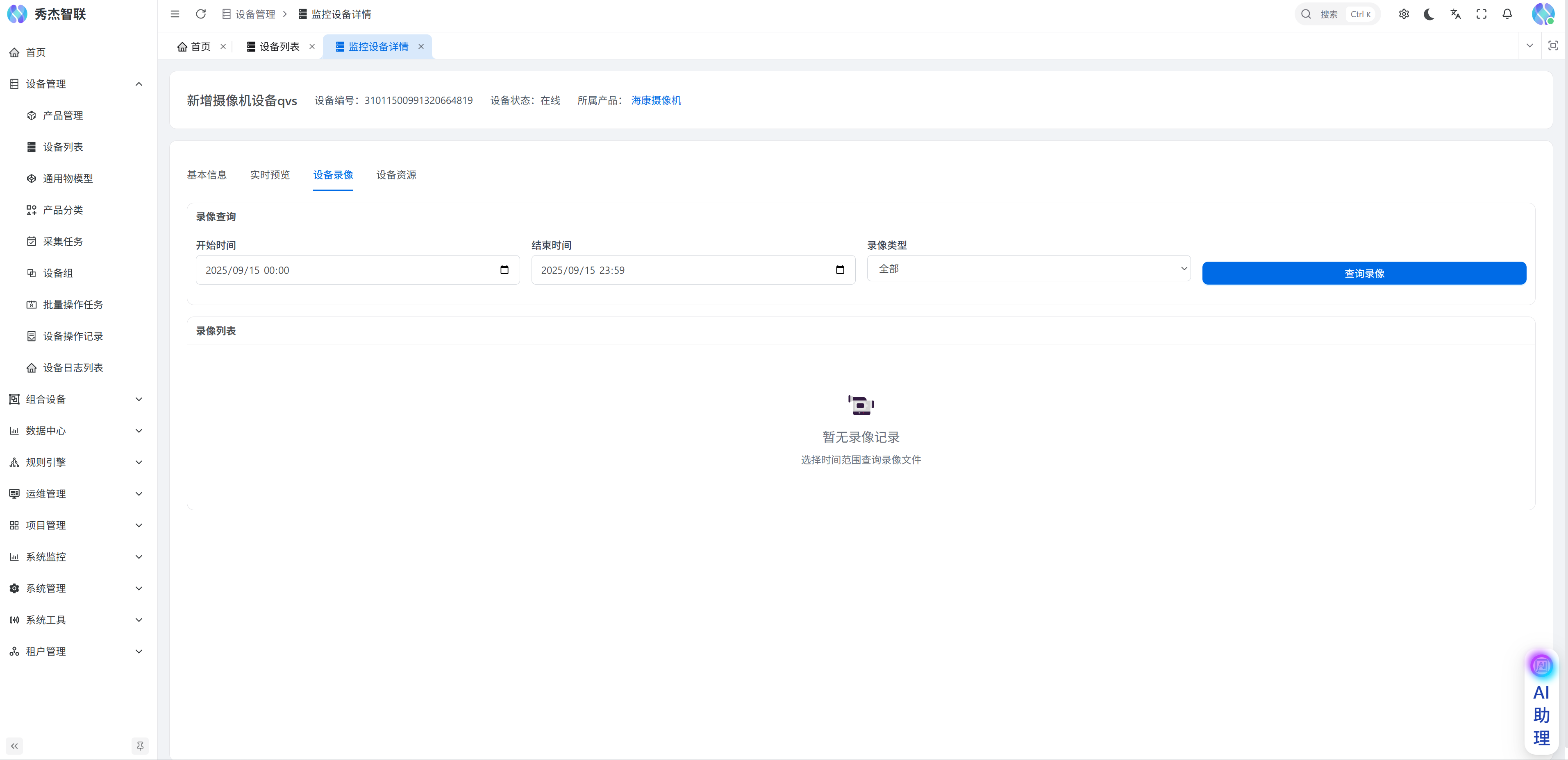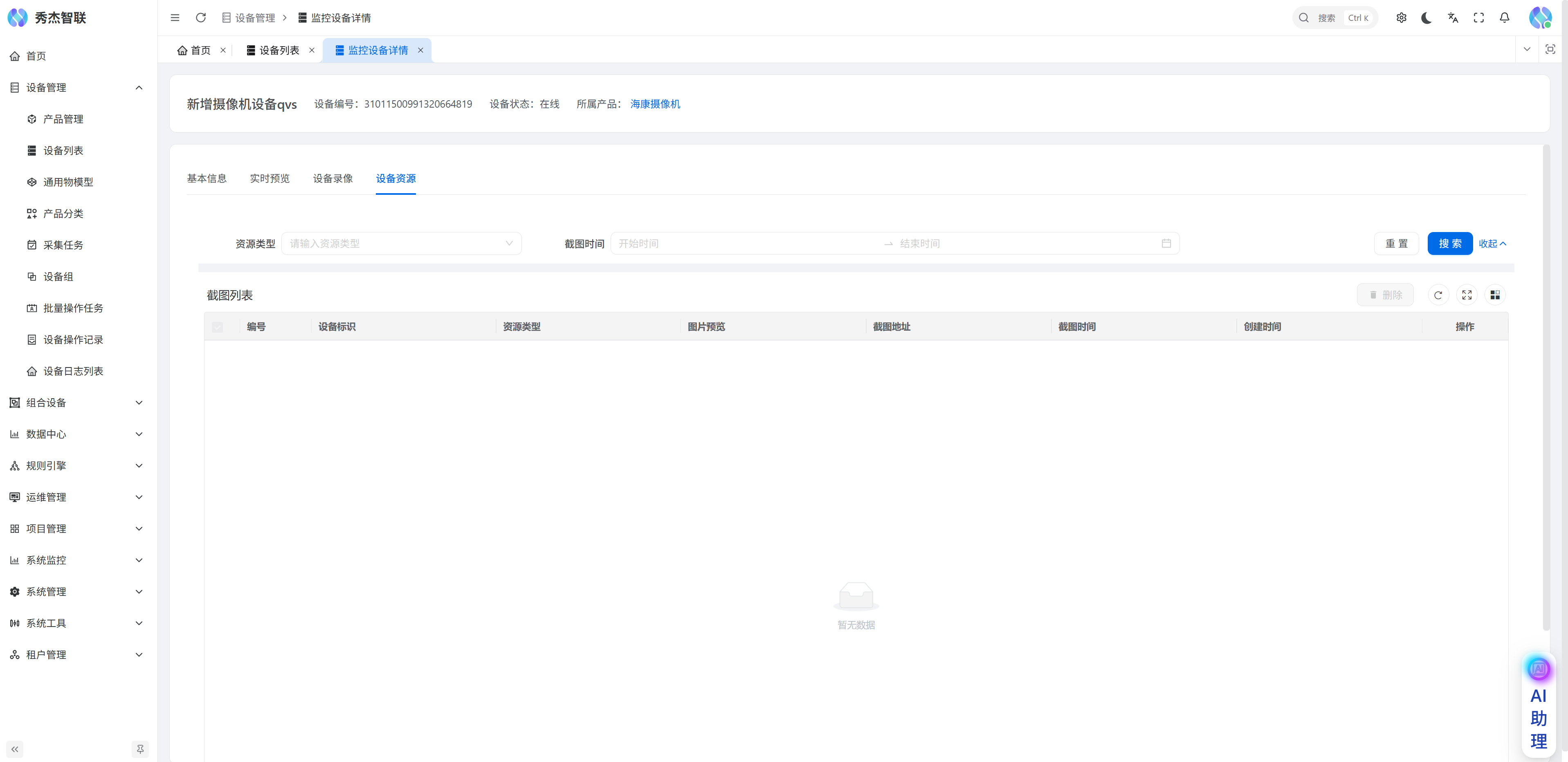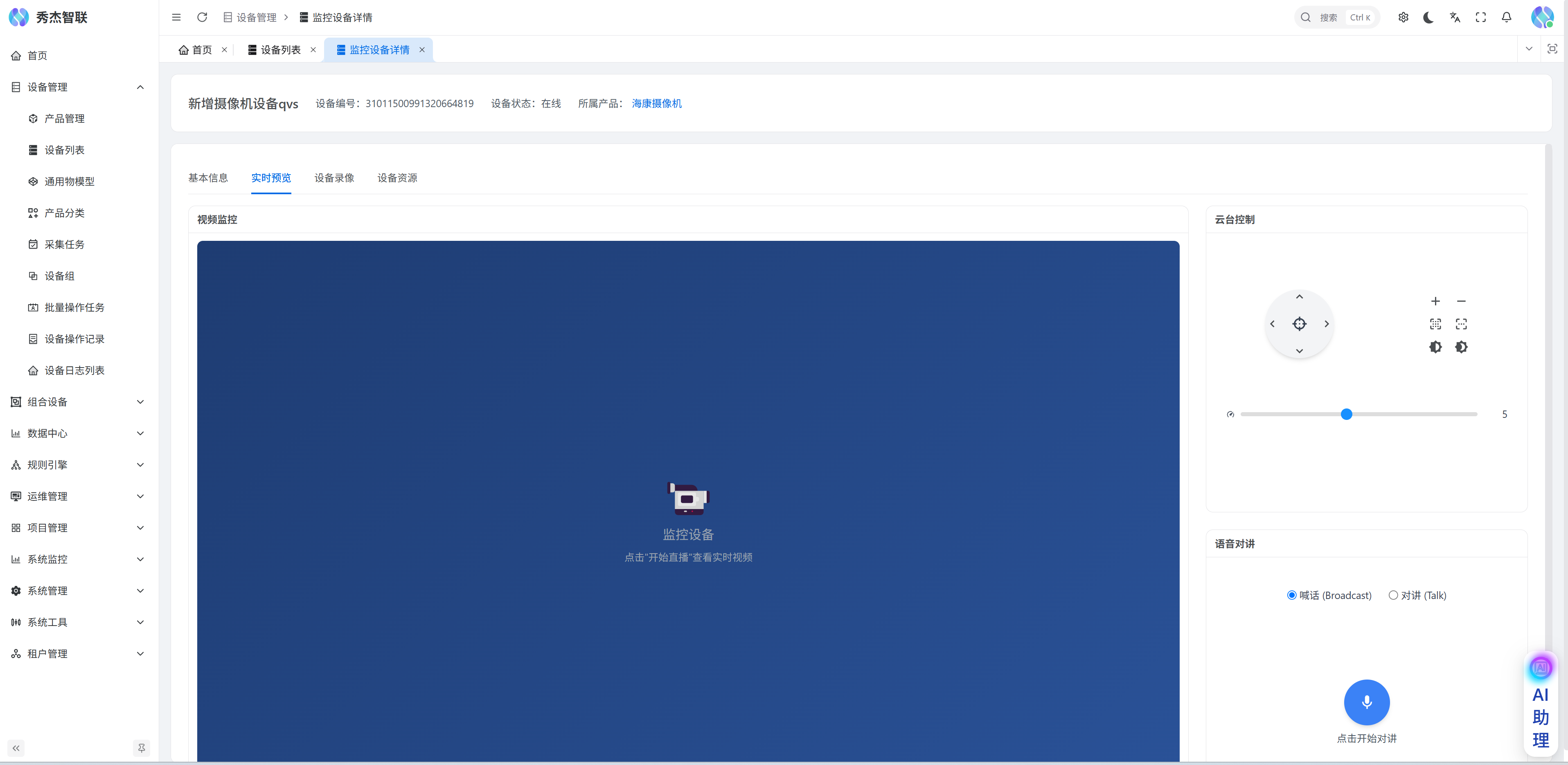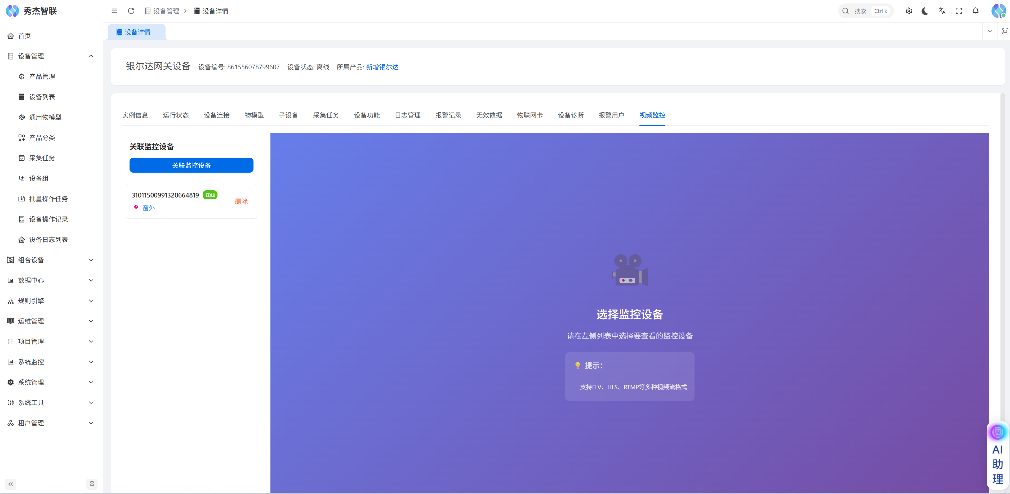 设备详情--视频监控,用来关联平台配置好的监控设备,查看设备直播状态