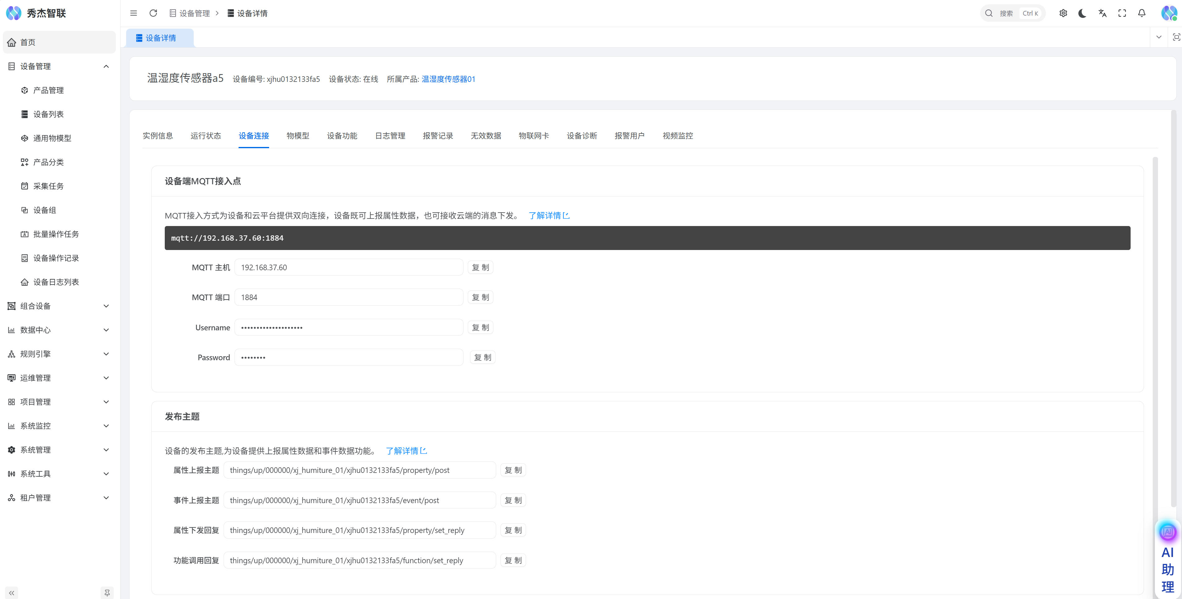 设备详情--设备连接;为设备接入平台提供接入点和username 和password,平台支持MQTT协议和TCP协议,并且包含发布主题和订阅主题,方便设备上报数据和接收云端指令