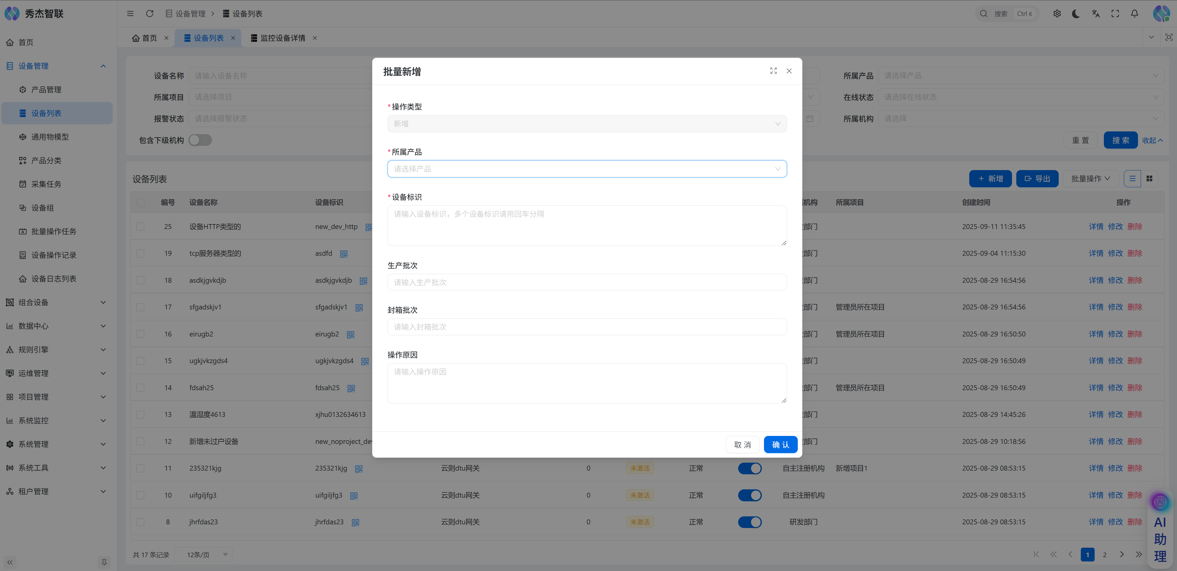 在“设备标识”中,可以写入多个设备标识号,以空行分隔,标注好生产批次和封箱批次后,点击确认即批量新增操作完成,可以在设备操作记录中查看结果。