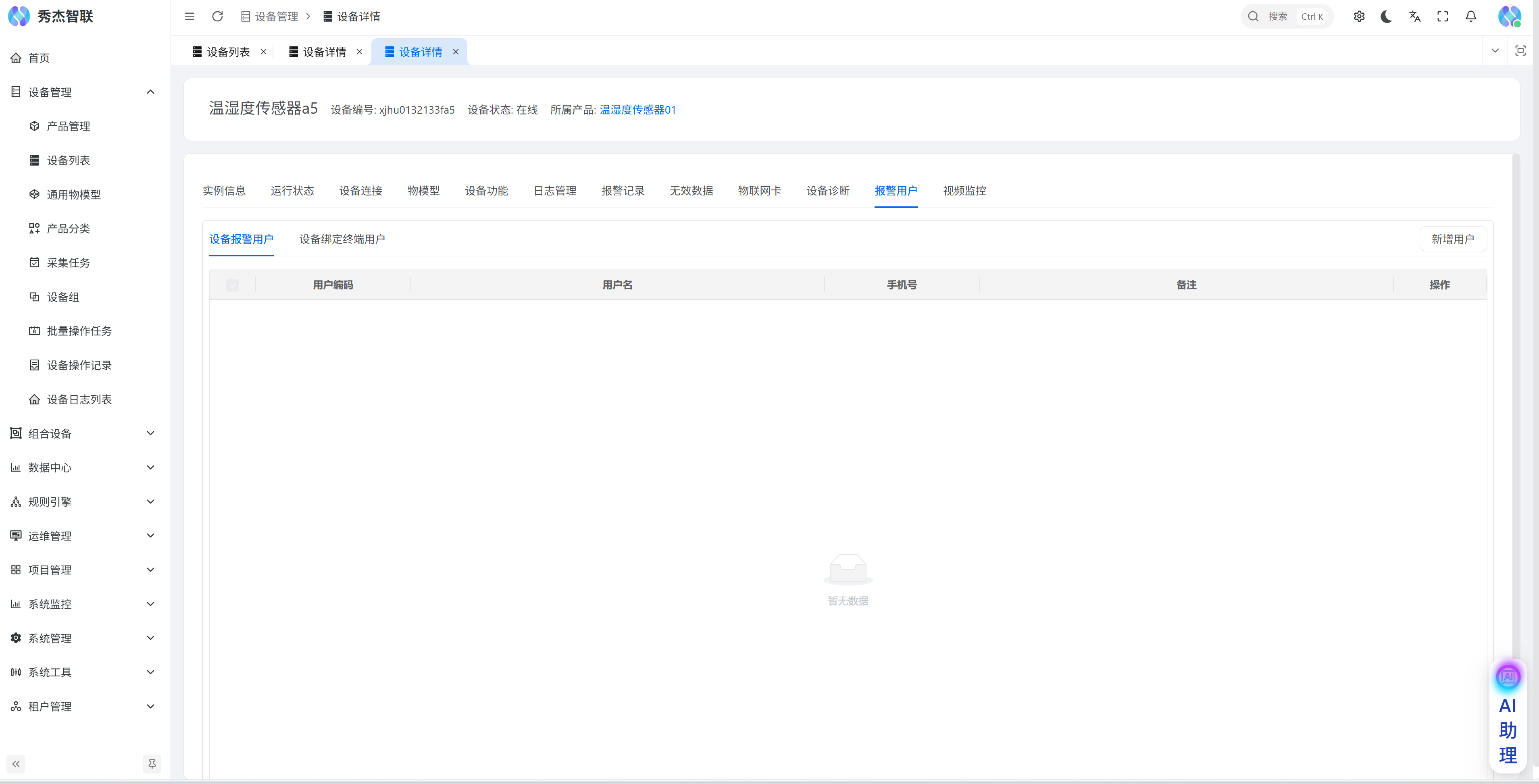 设备详情--报警用户,可以新增设备报警用户,用来新增“报警配置”时,配置设备告警需要通知的用户,查看设备绑定终端用户,