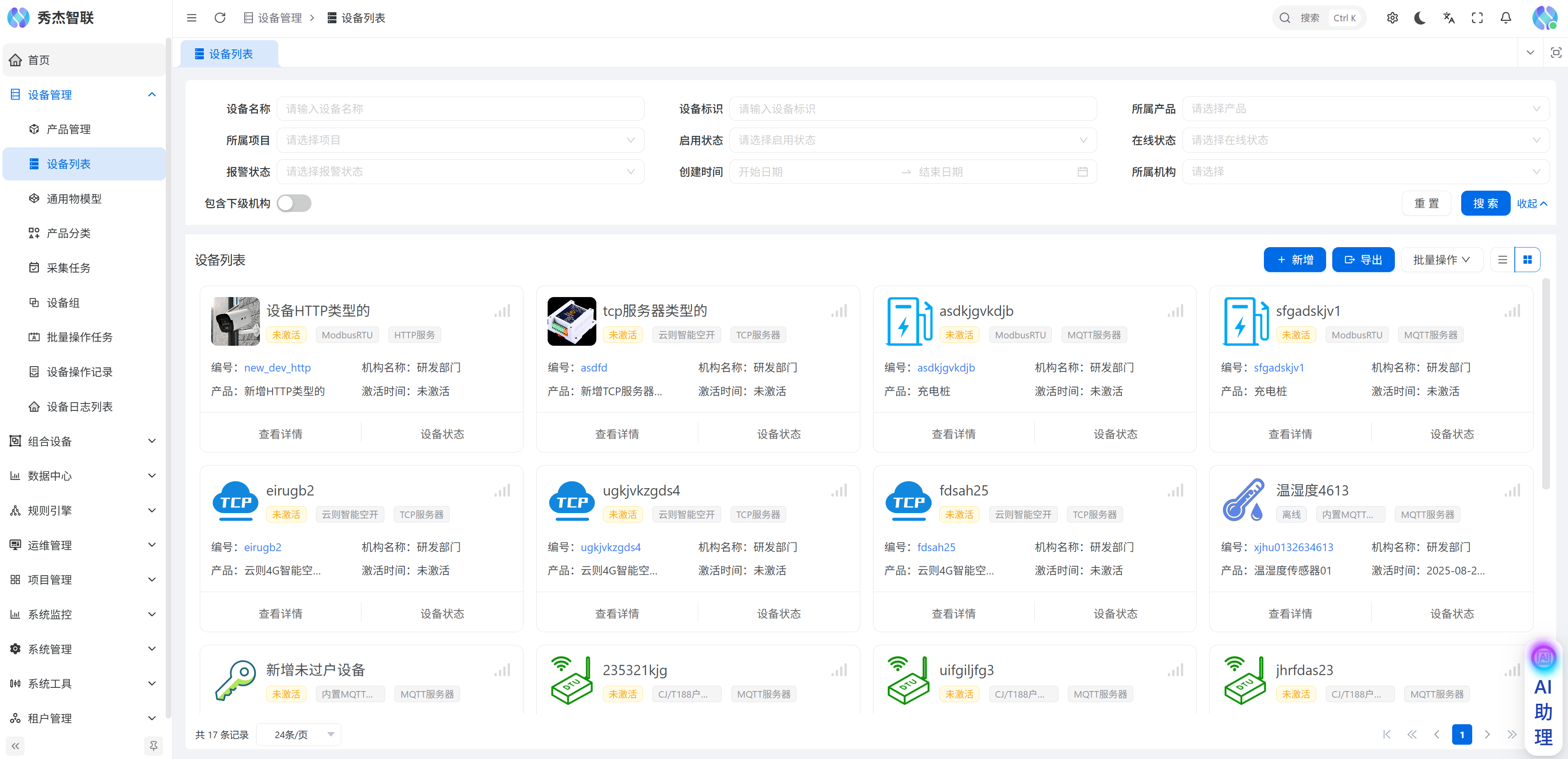 设备列表页面提供数据筛选、新增设备、导出设备、批量操作(批量新增,机构过户,项目划拨,批量删除)、设备操作(详情,修改,删除)等功能模块。