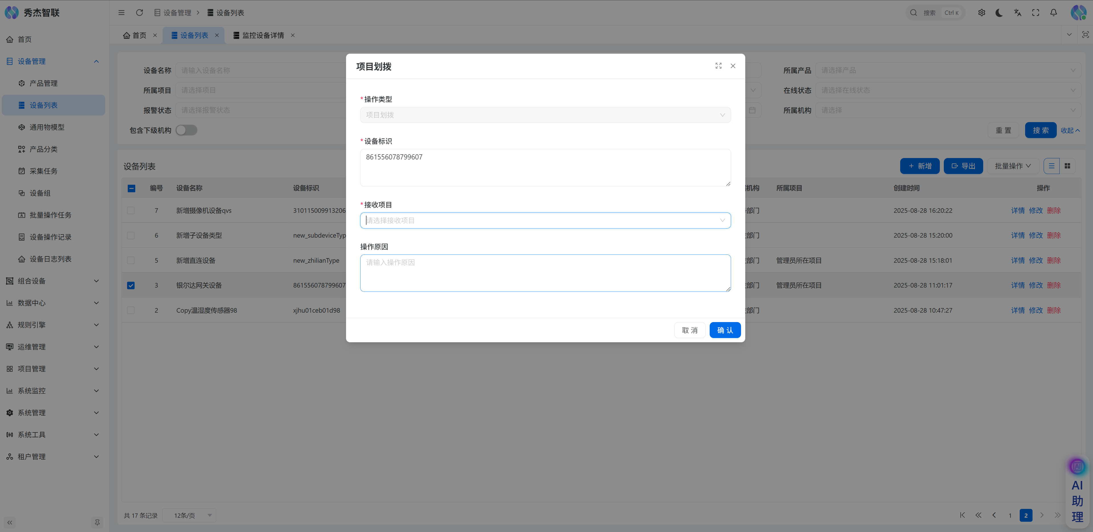 在设备列表中勾选需要项目划拨的设备,选择好“接收项目”,点击“确认”之后,可以在设备操作记录中查看结果。