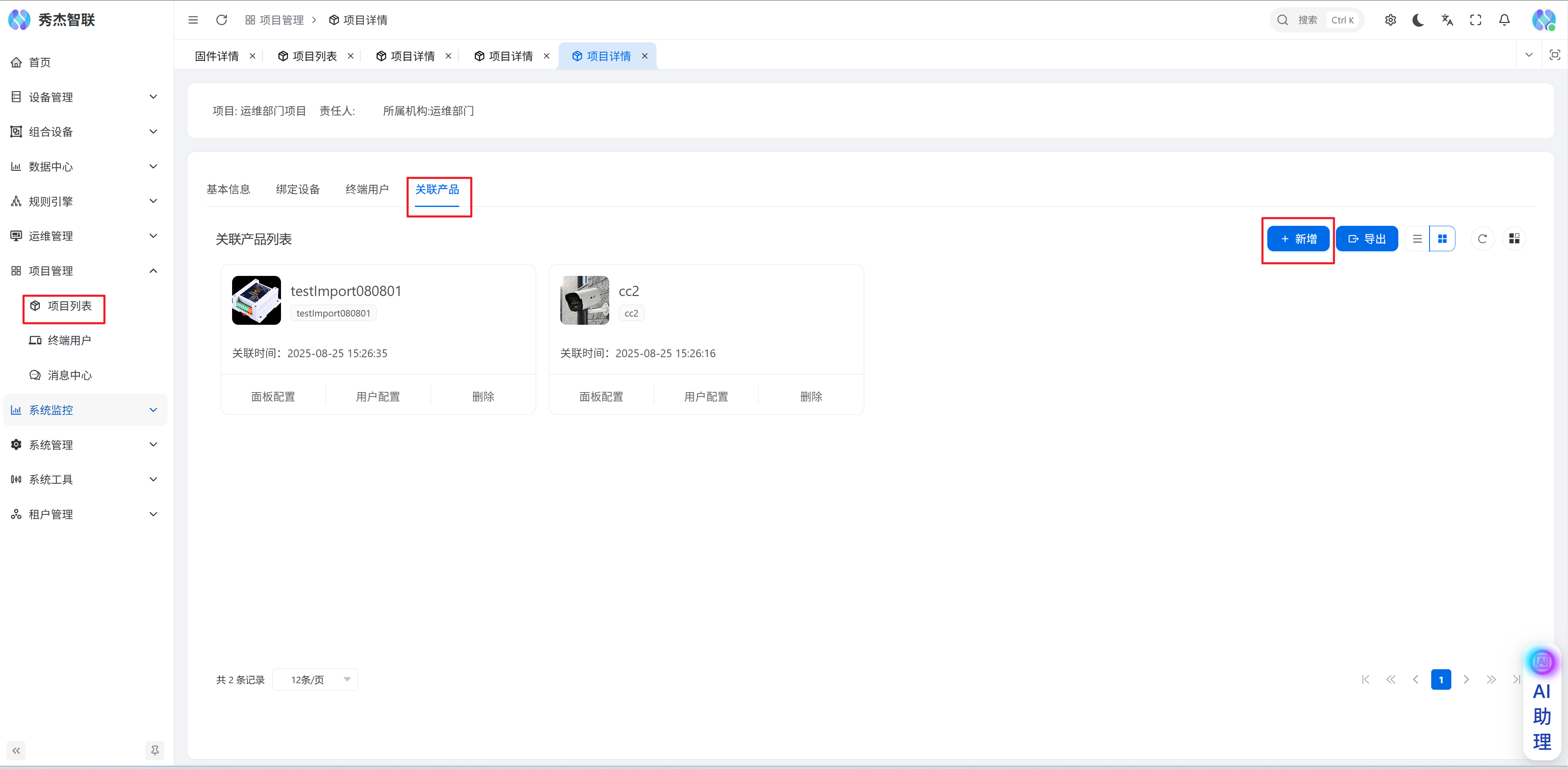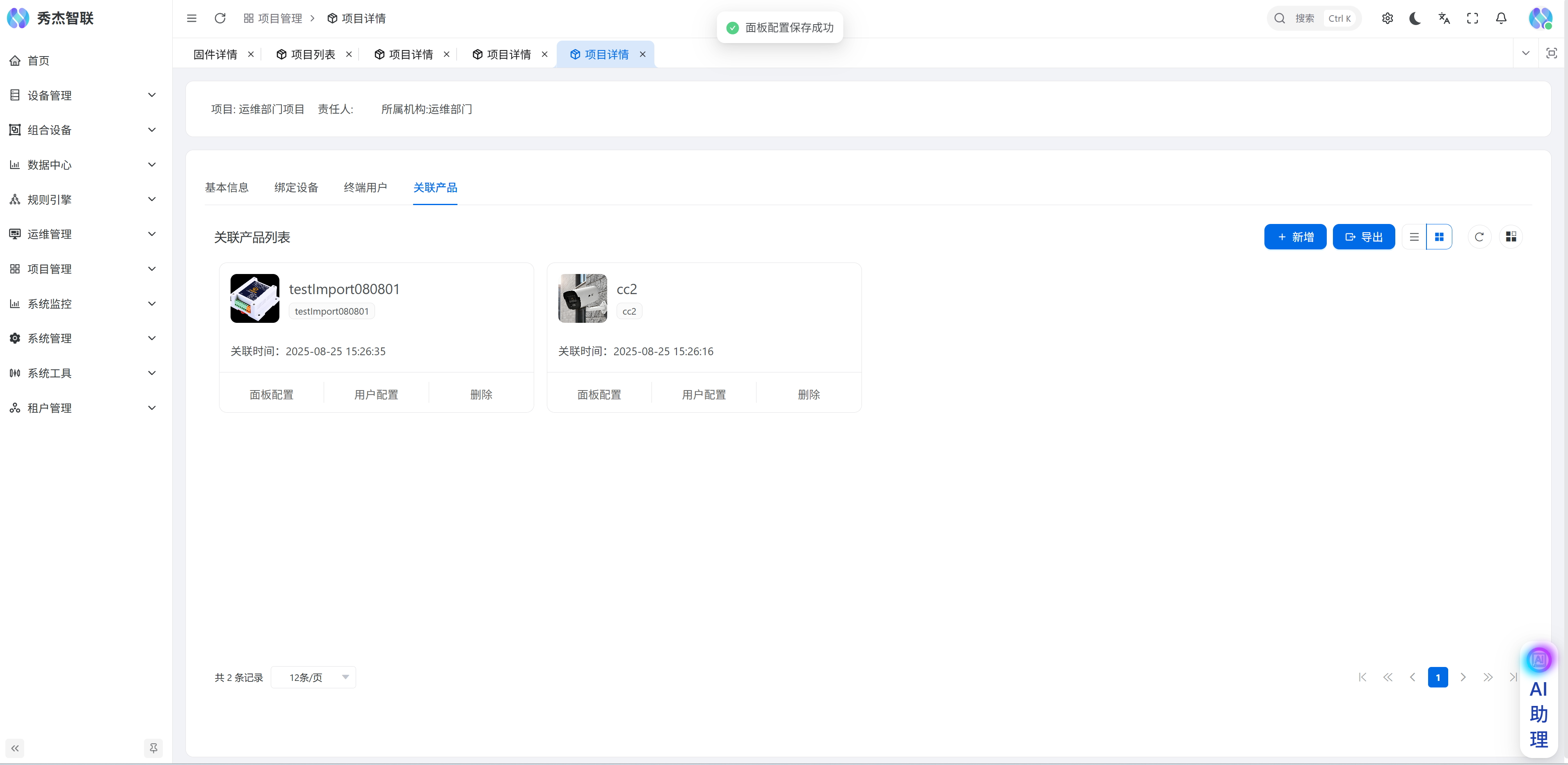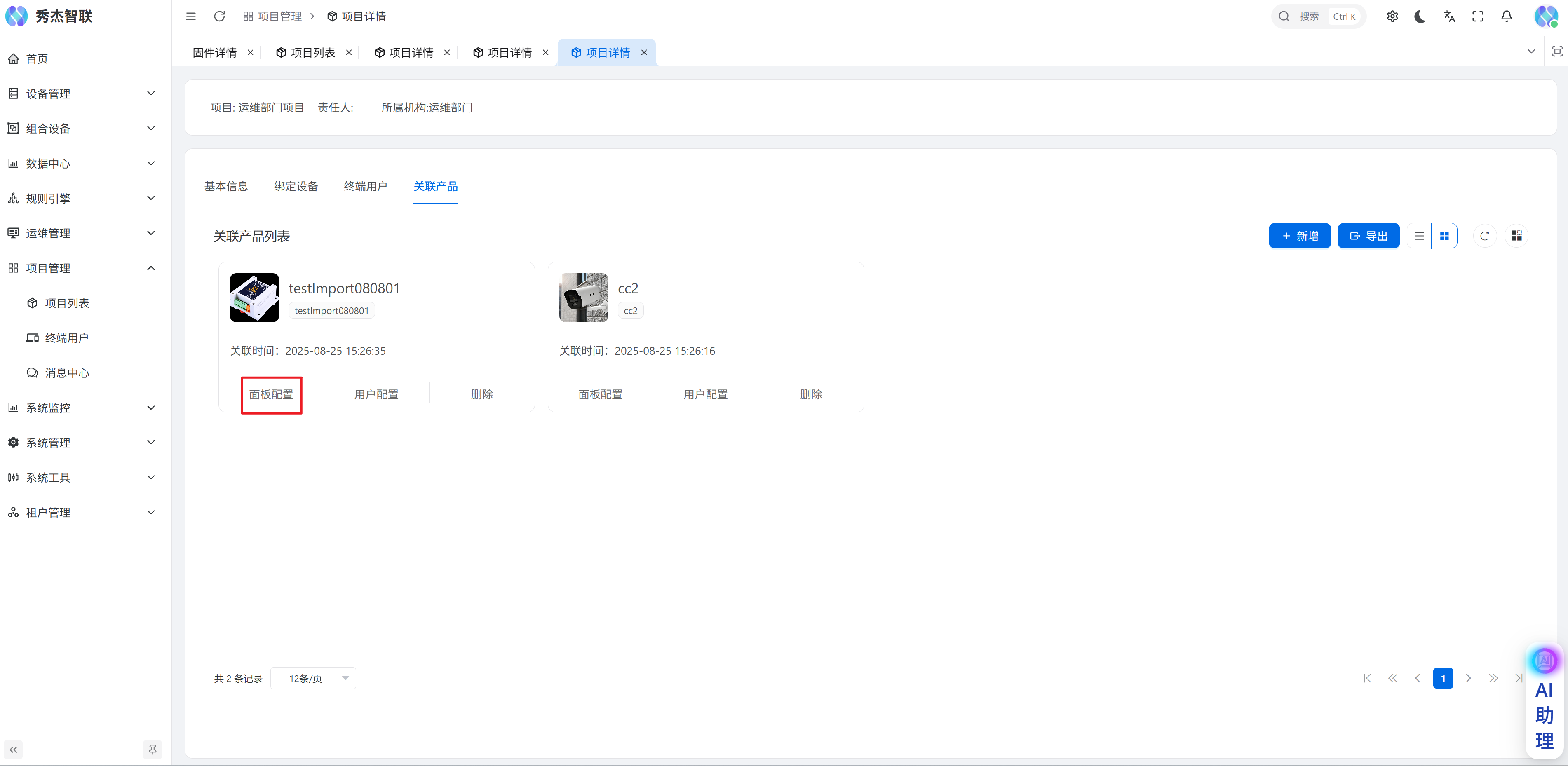 设备面板是可编辑的,您可以在项目管理->项目列表->进入到特定的项目详情中,在页面找到关联产品页面,在这里可以新增产品;