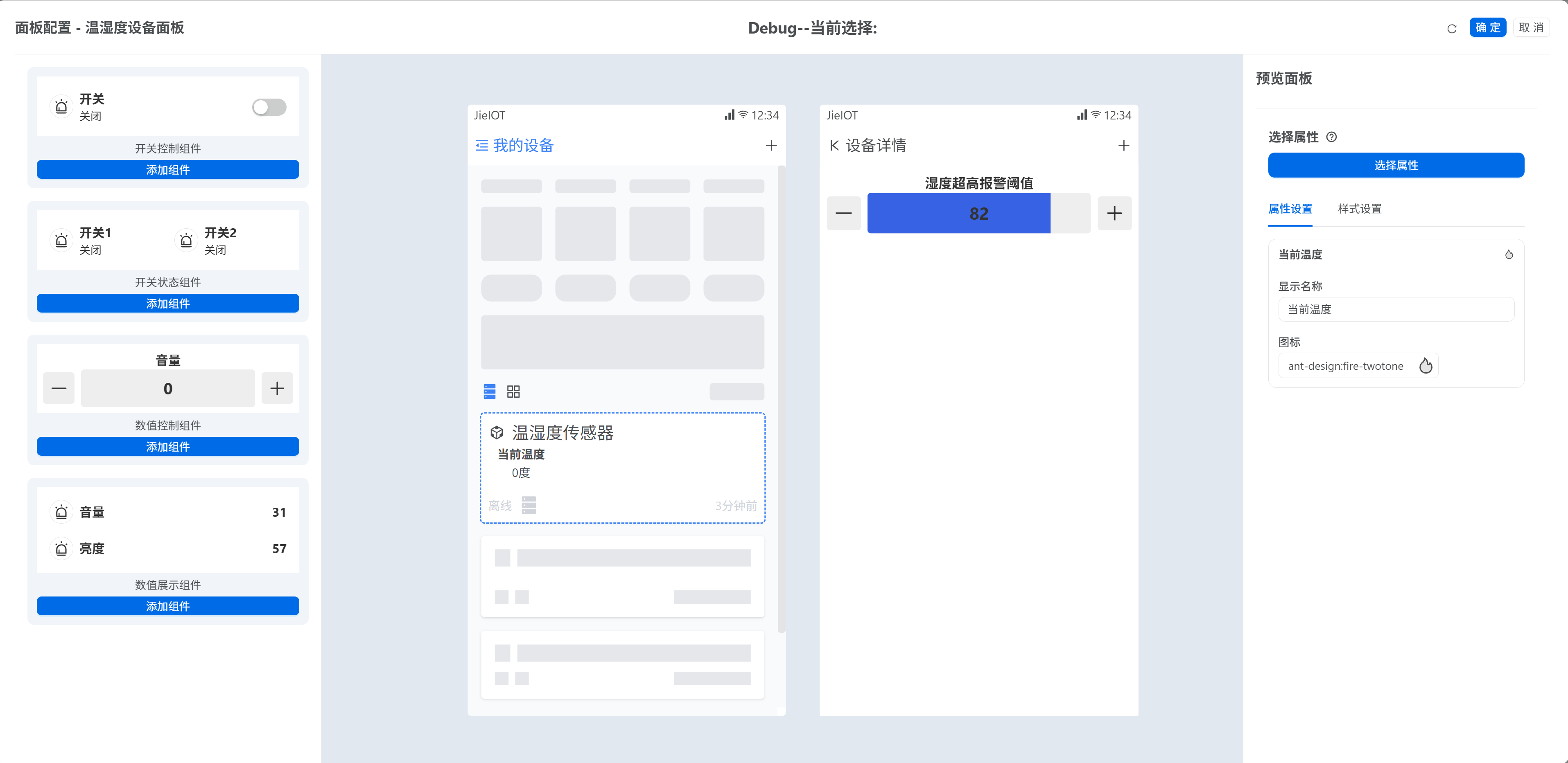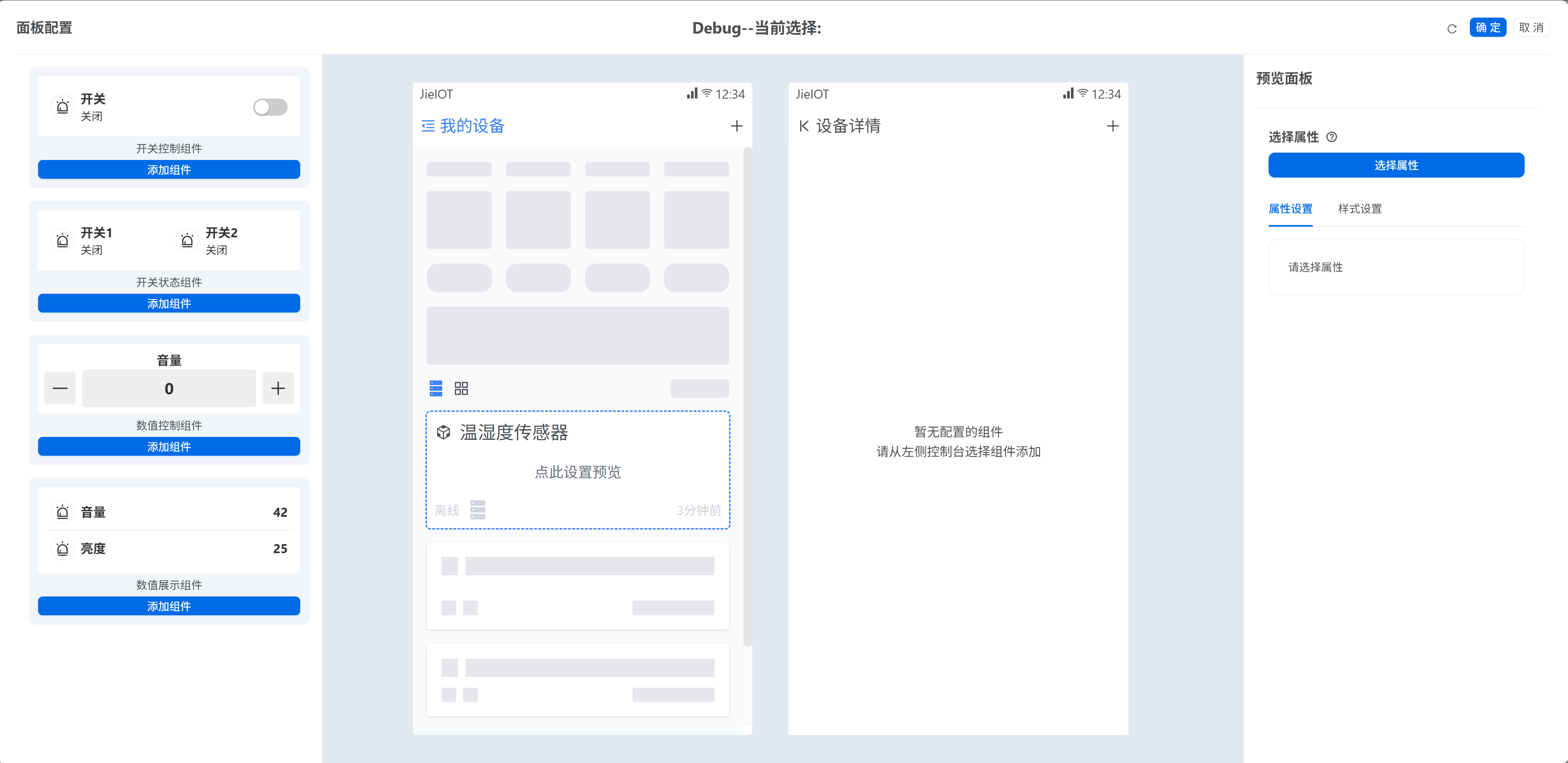 - 2.在面板配置编辑器中,左侧选择需要的组件类型,点击“添加组件”后,可以看到面板中间的设备详情部分展示的组件,