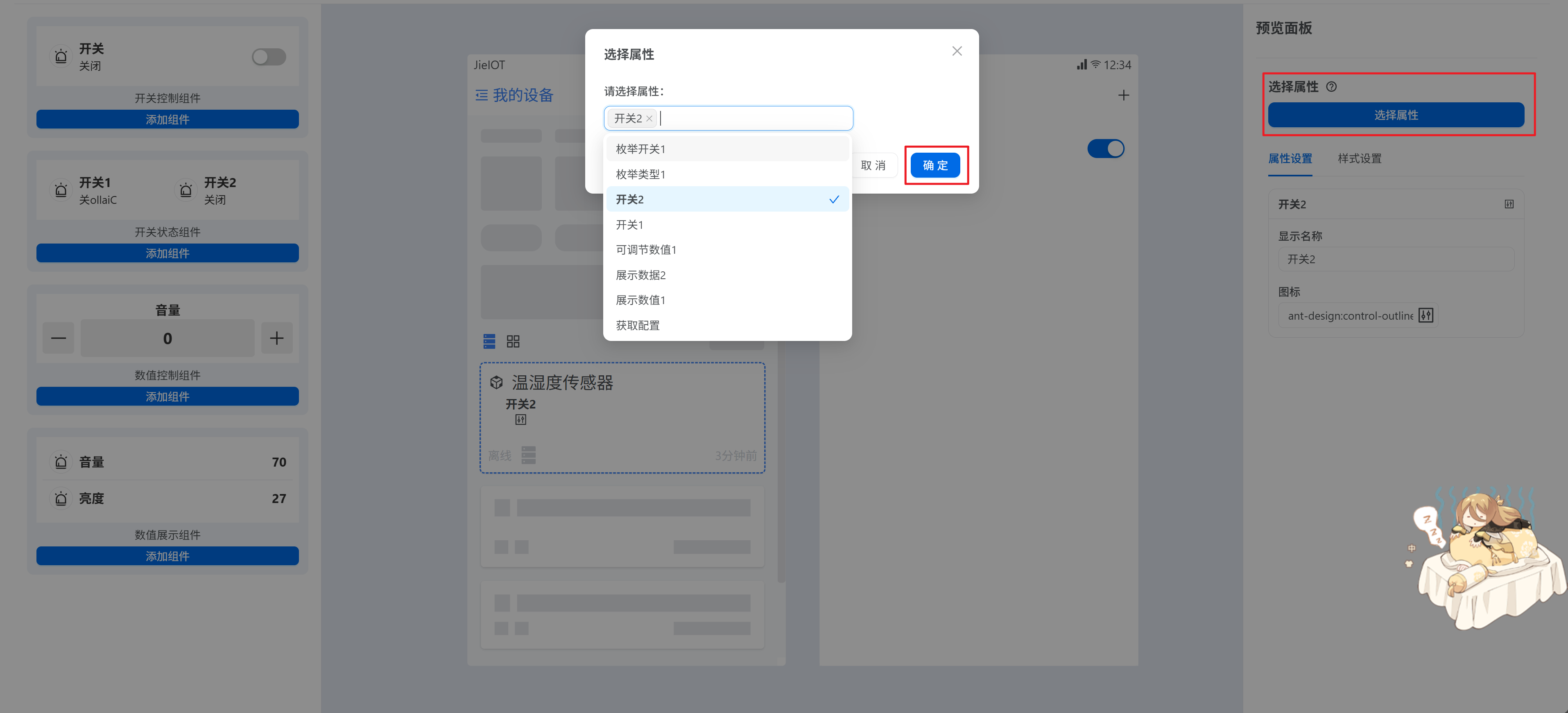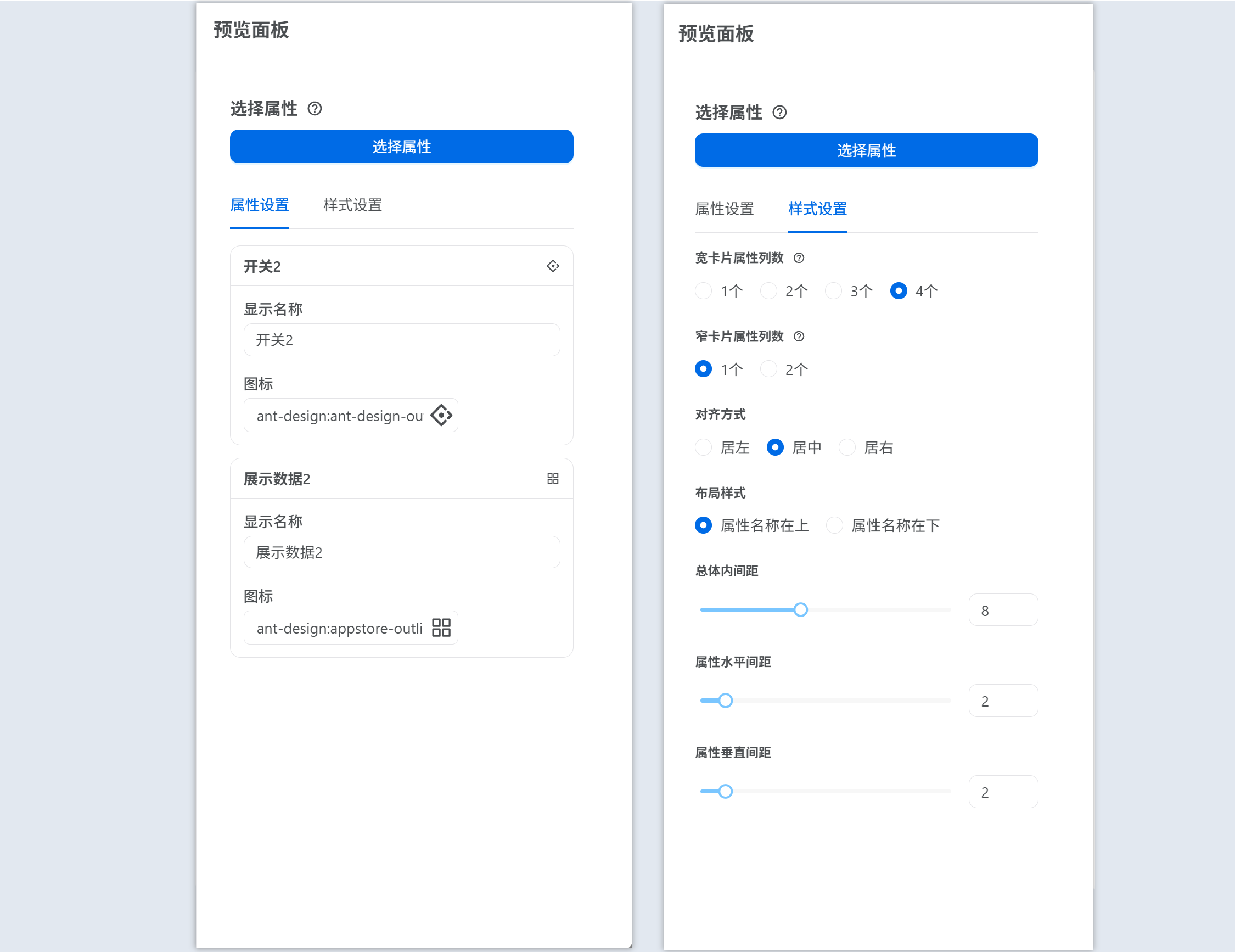 - 3.点击右侧的属性选择按钮,选择要展示在组件上的属性,选择属性后点击确认,面板中心即会展示对应属性。