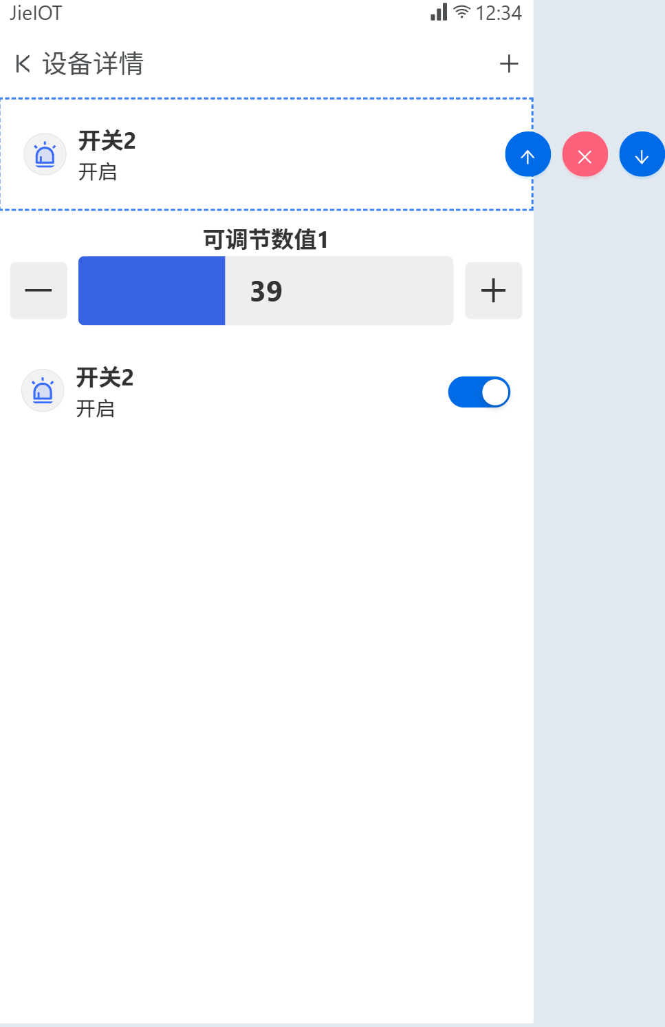 JieIOT 提供了点击即用的可编辑运行状态面板。用户在登录移动端后,可以看到自己绑定的一个或多个设备,点击设备后进入设备详情页面,这个页面也被成为设备面板。