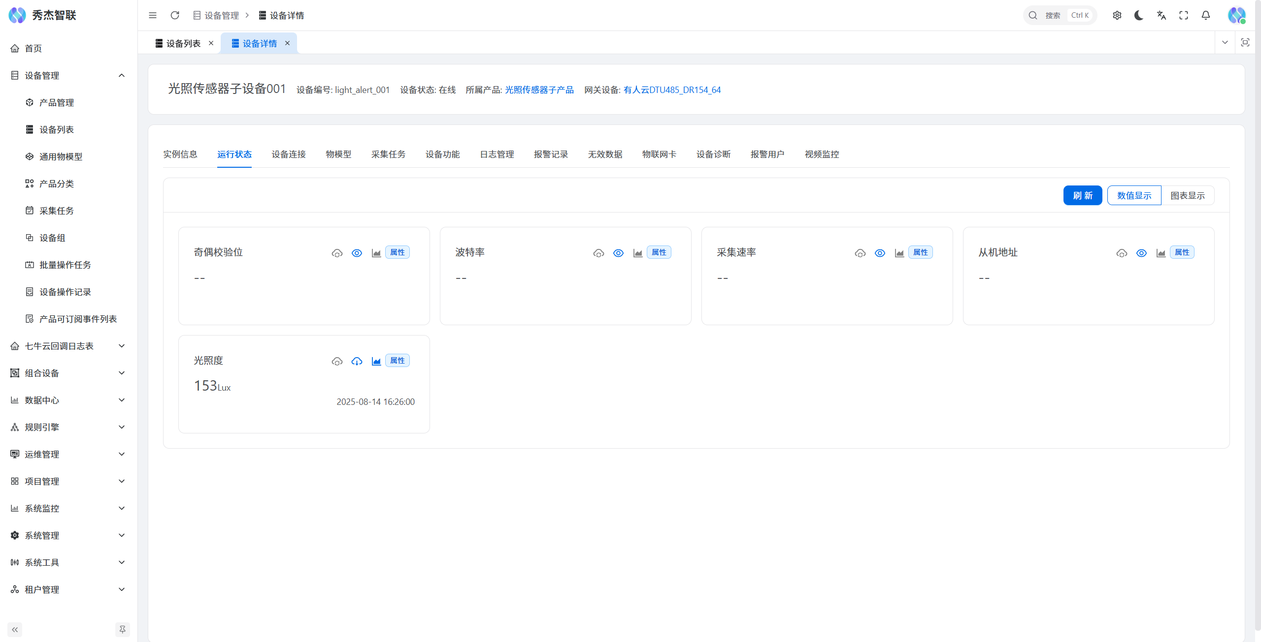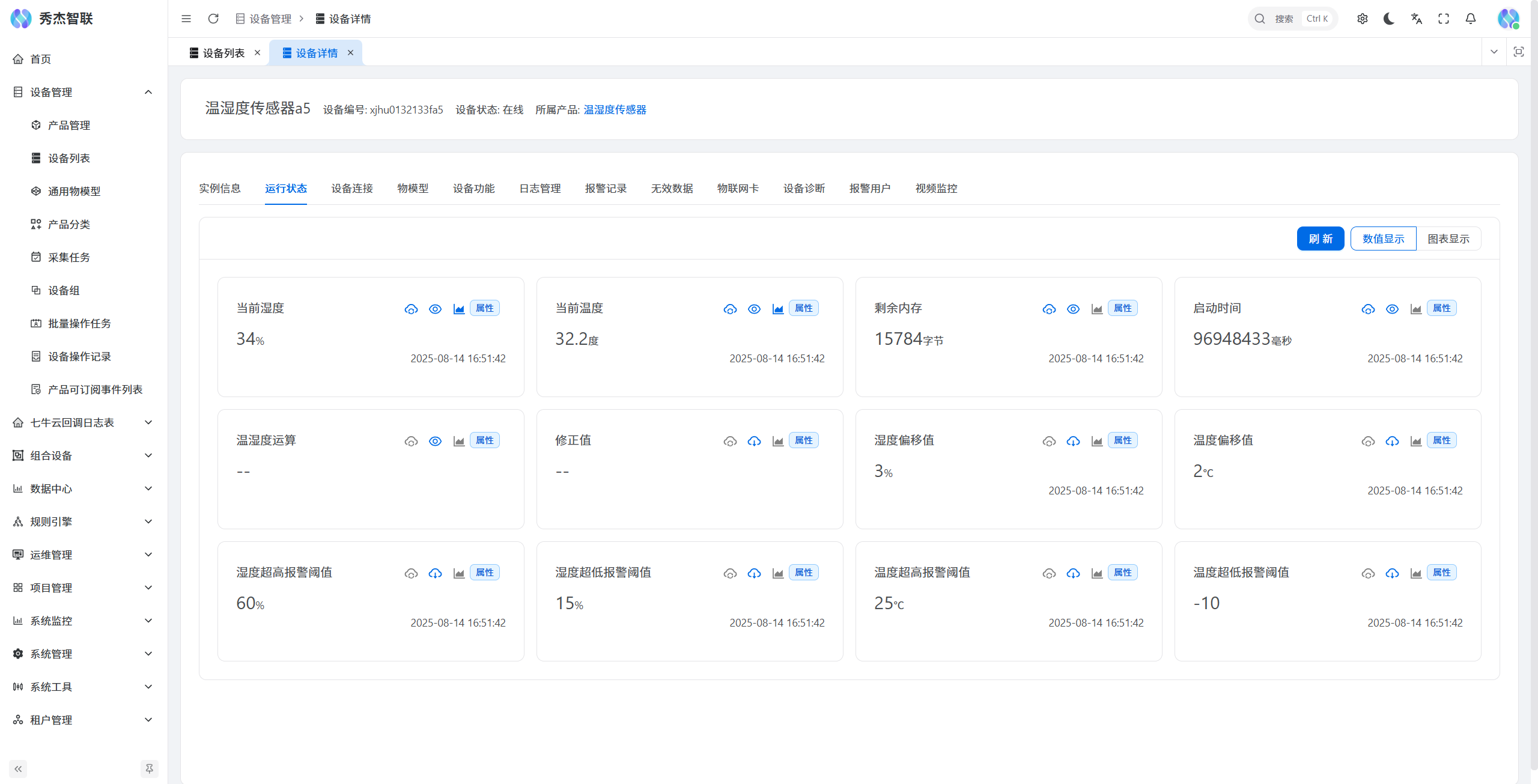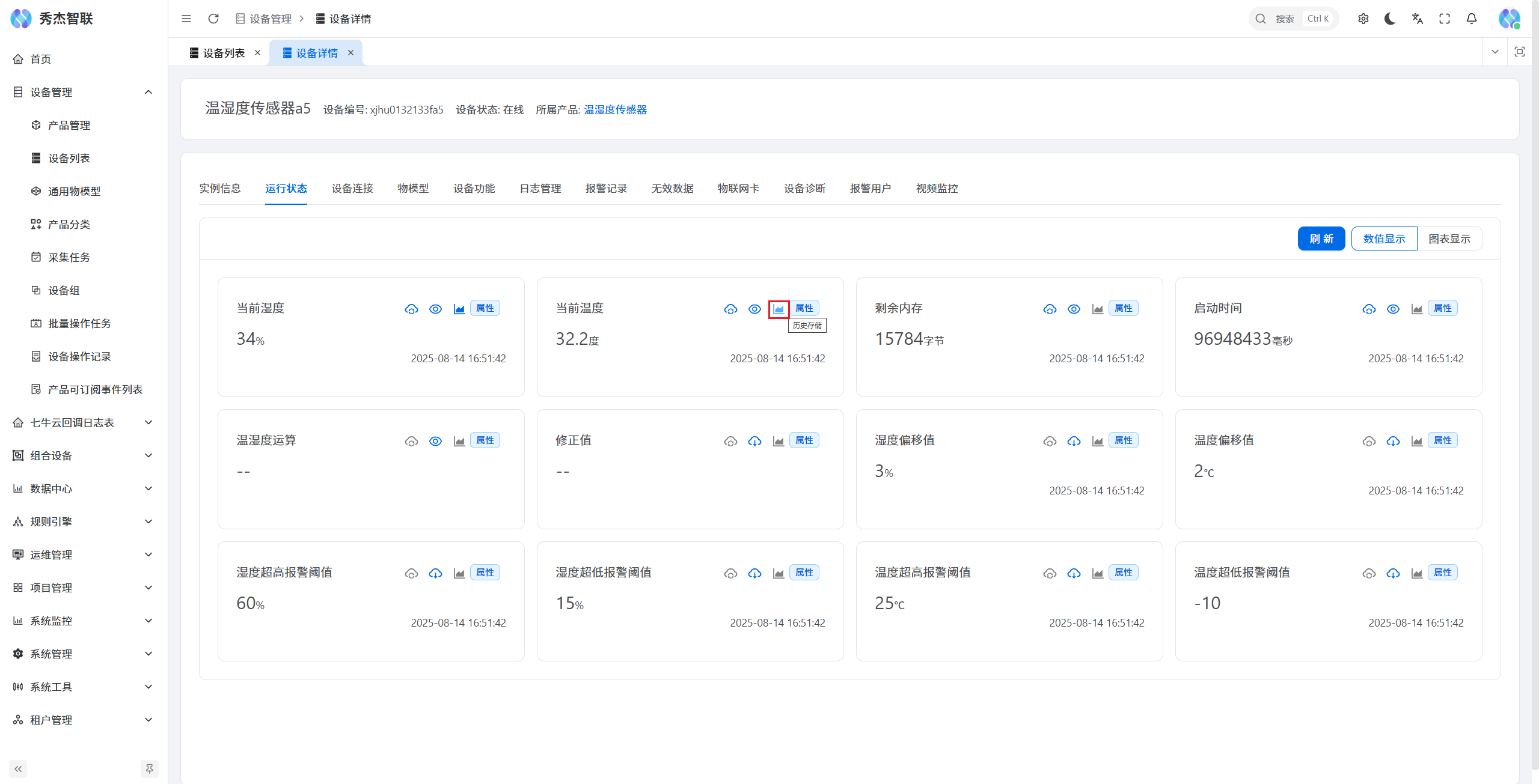 进入设备管理 -> 设备列表,在对应设备的右侧点击详情,进入设备详情页后,在运行状态 界面,系统会自动展示设备各项属性的当前数值。