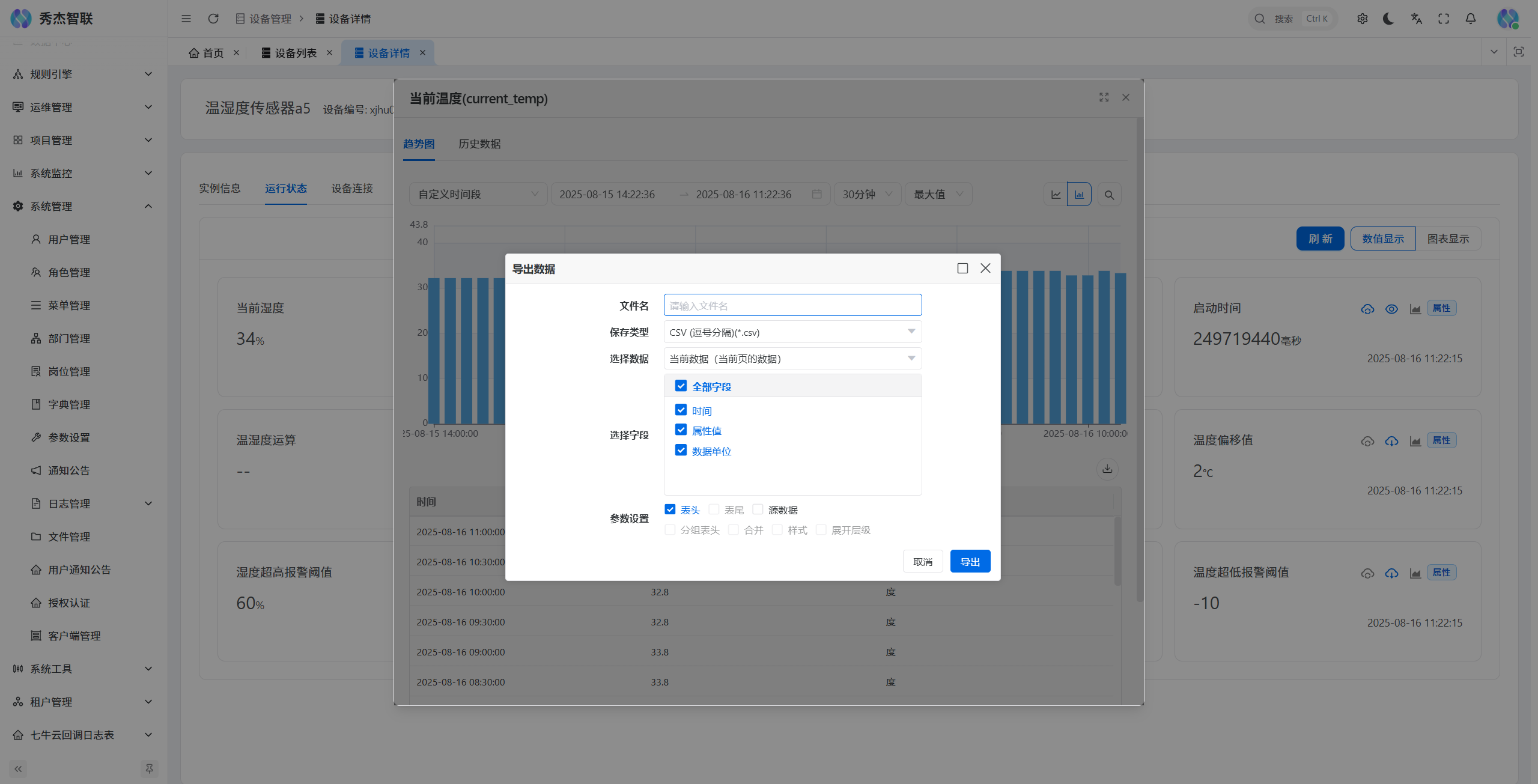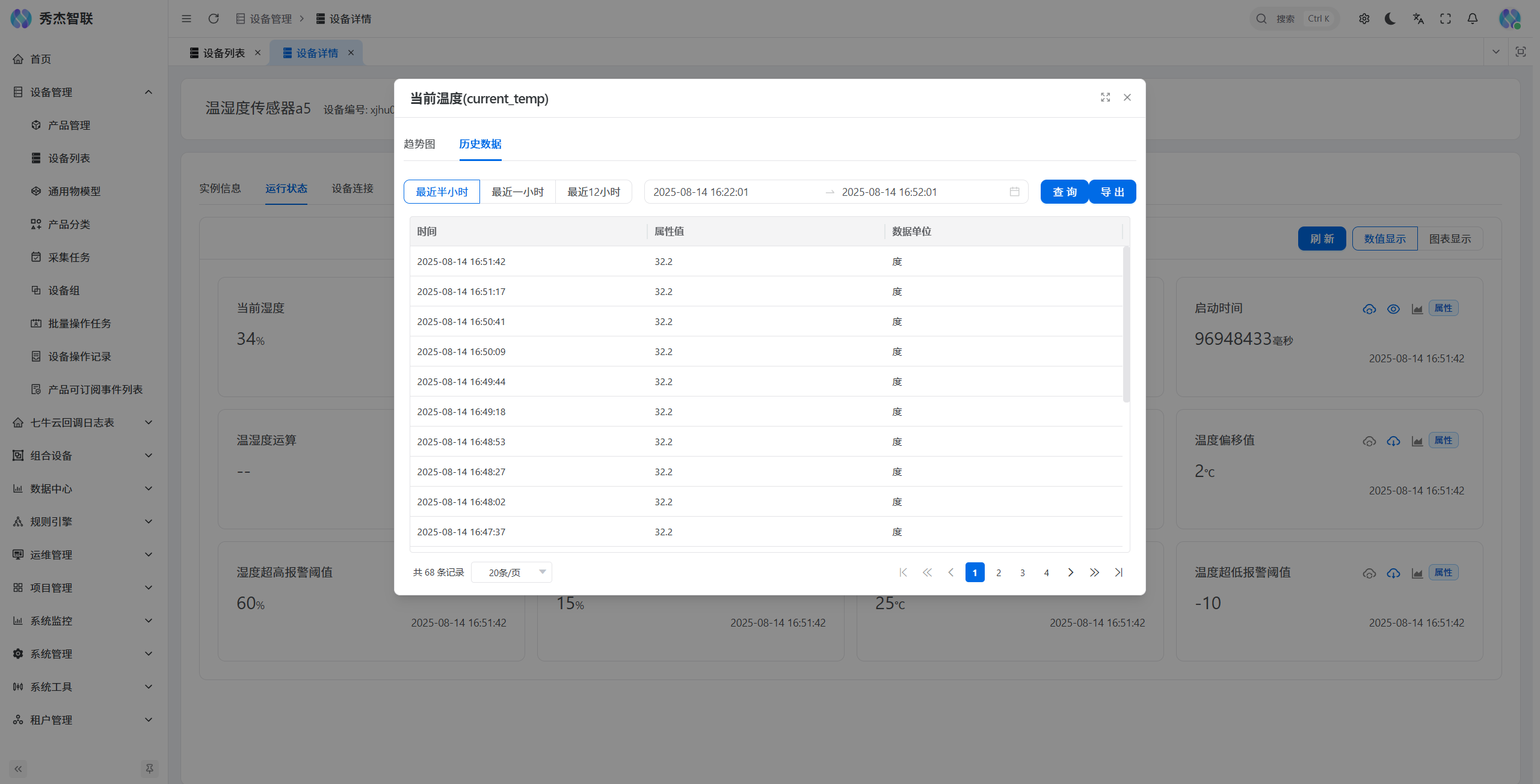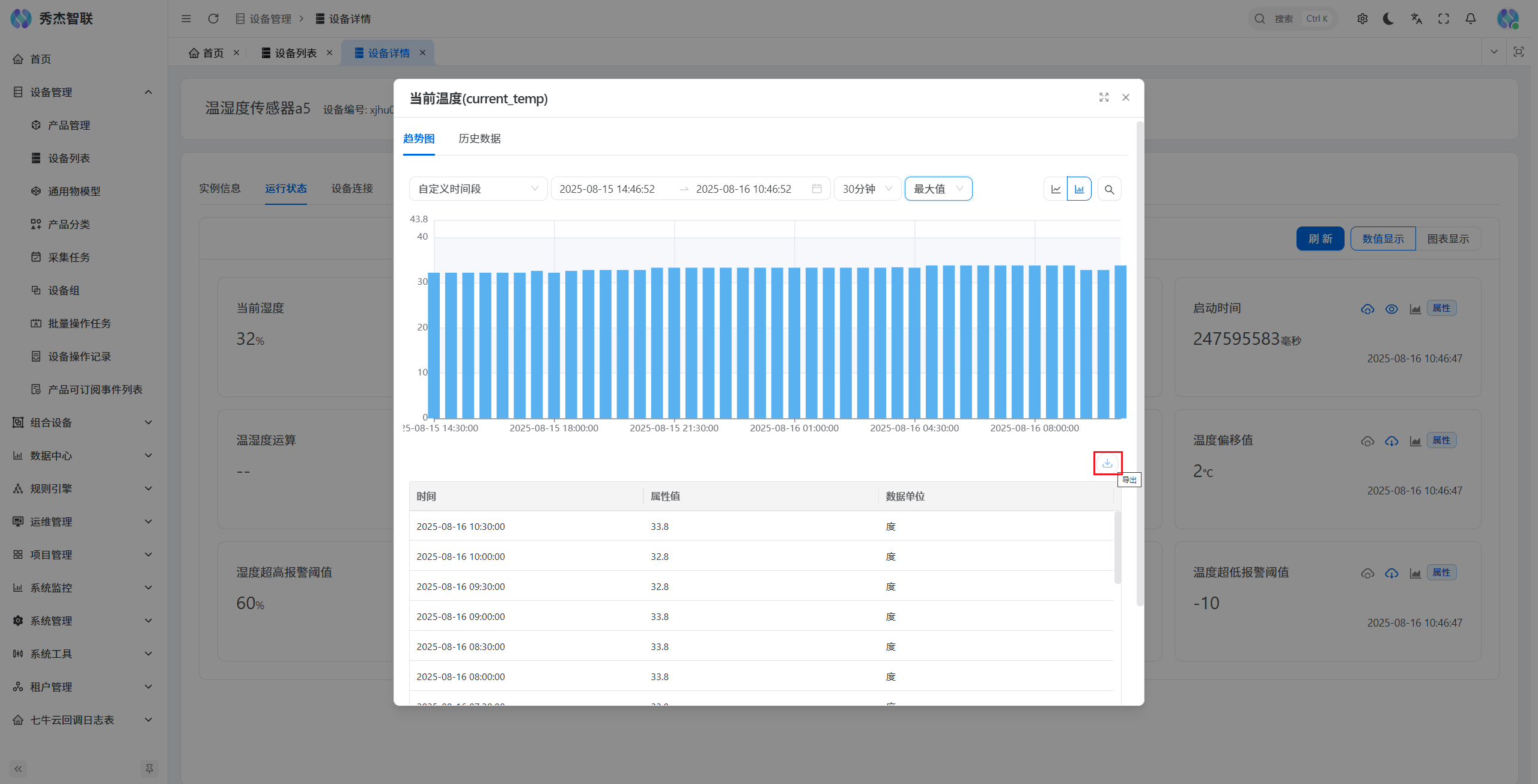 点击之后会展示属性的历史数据,平台支持不同的时间段,您可以查看想要的时间段的属性数据。同时,您还可以导出所选的历史数据到 Excel 中,用来更好的分析或记录设备,只需要点击右上角 导出 按钮