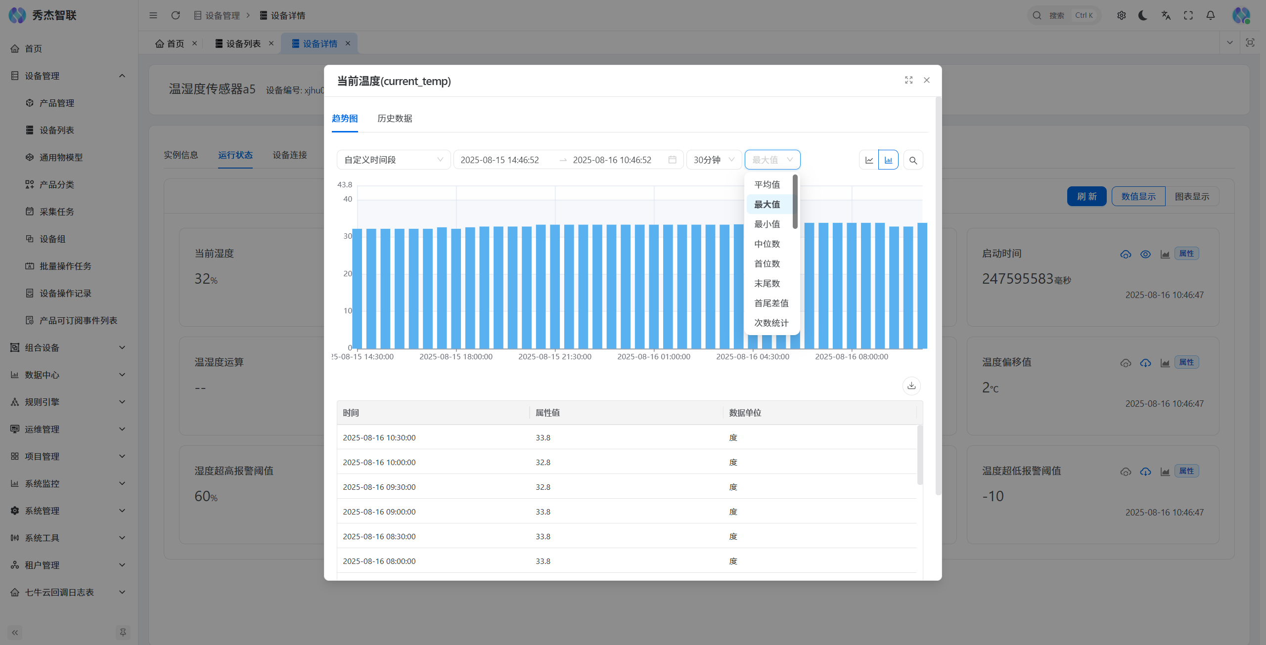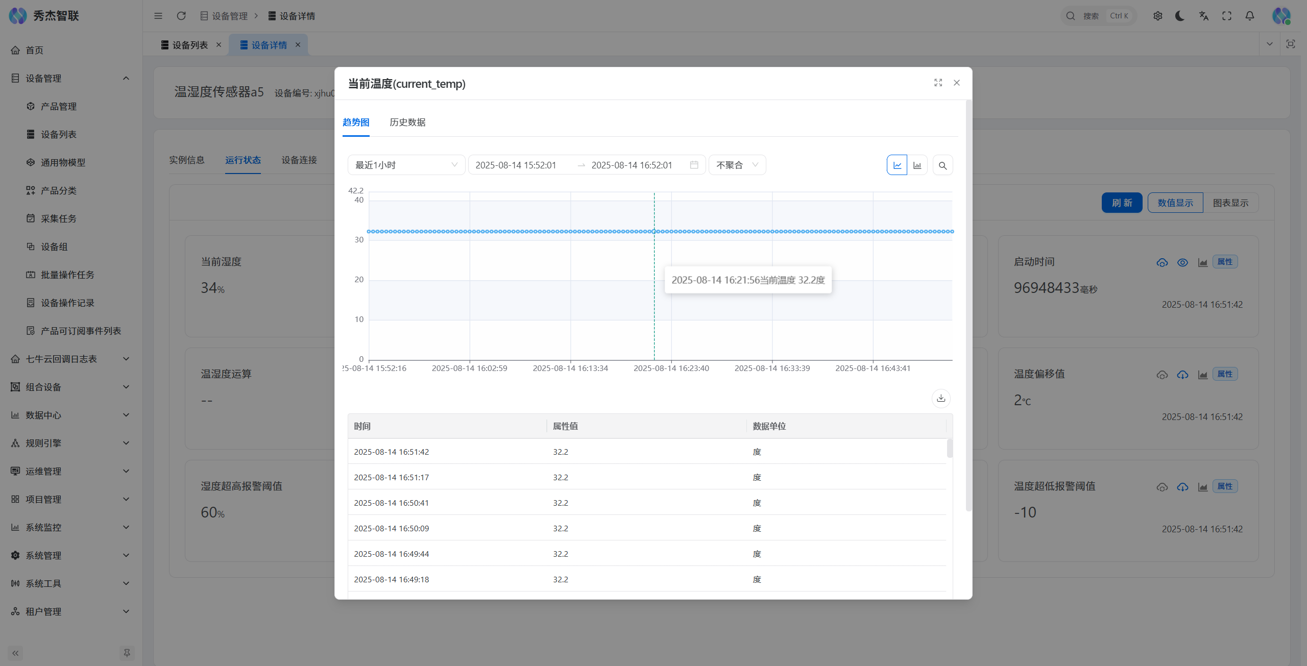 在设备管理平台中,设备进行属性上报后,您可以在设备详情页中实时查看设备的属性数据,包括当前属性值和历史数据。