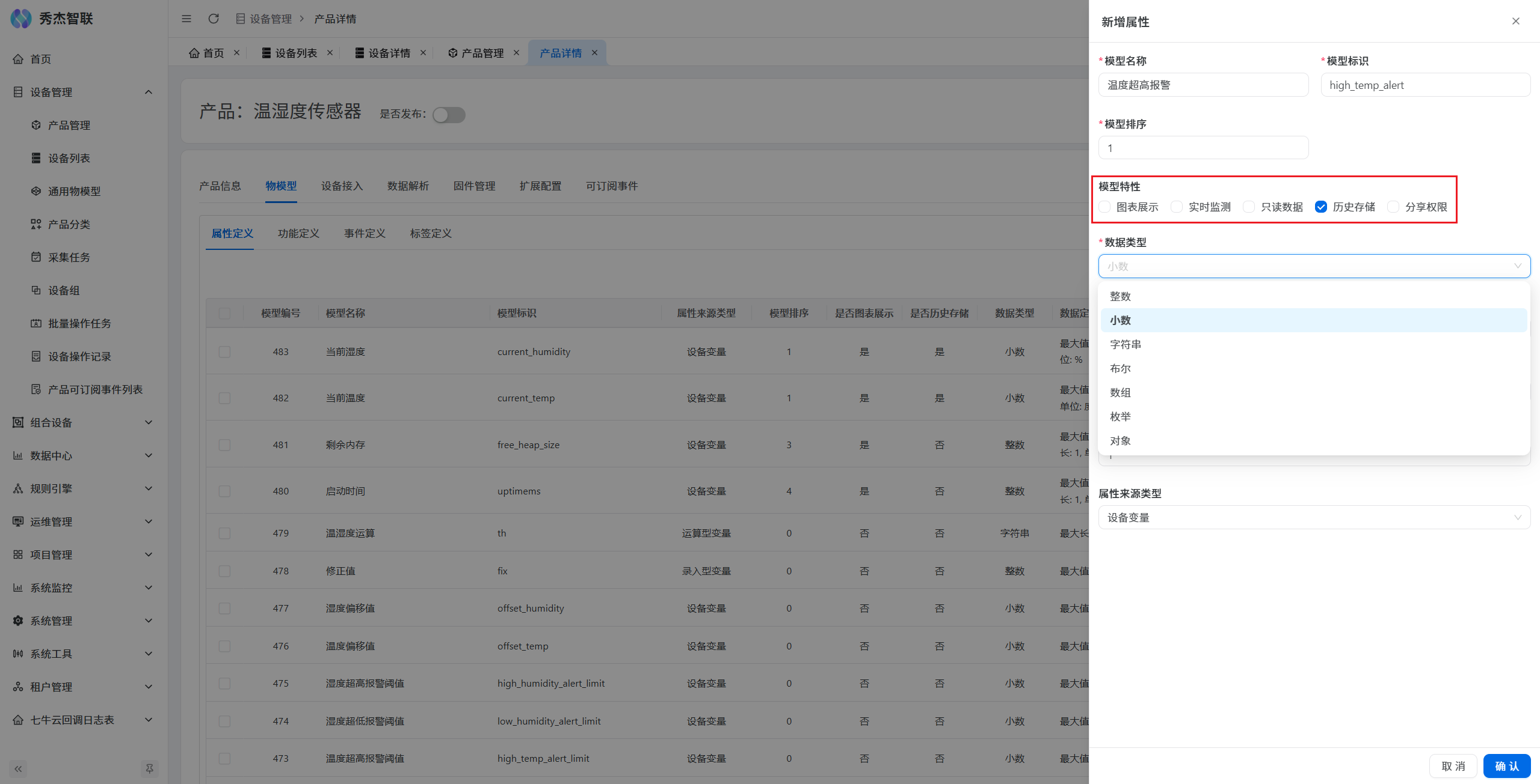 在新增属性时,您可以根据产品特点填写模型名称,并填写模型标识,在模型特性中勾选您需要的模型特性,并选择数据类型,填写数据范围,来更好的控制属性数据。