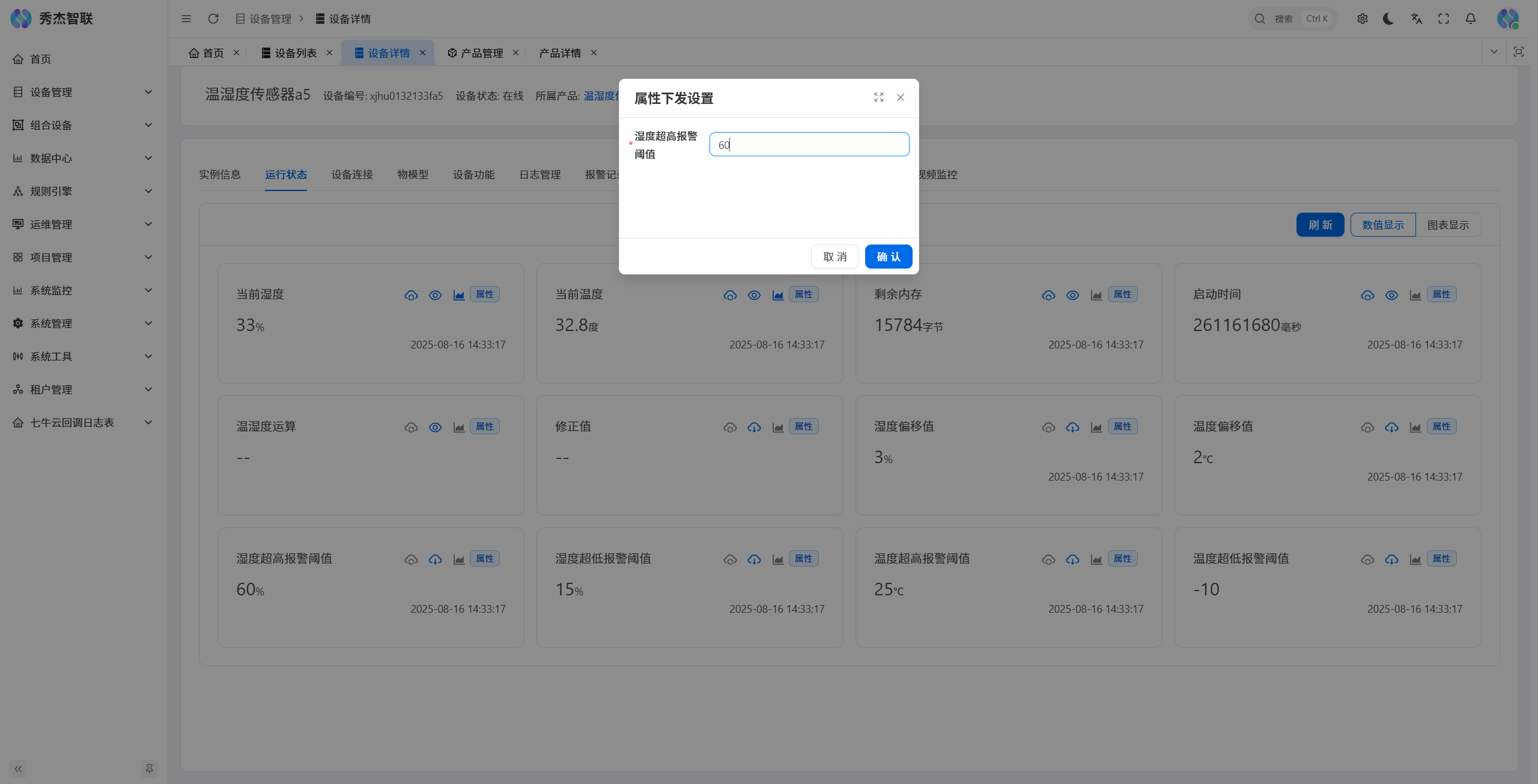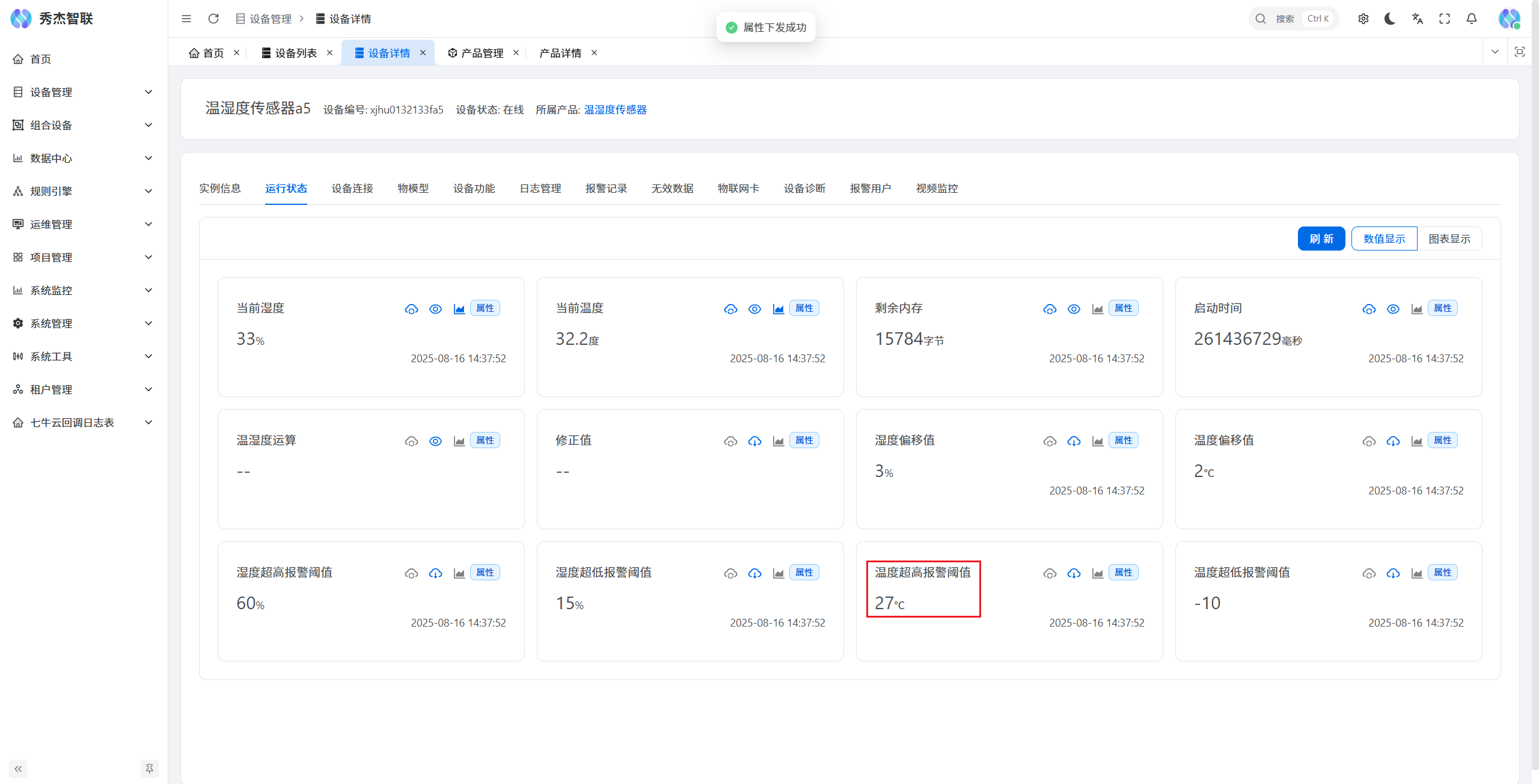 在数据配置完成后,点击确认按钮,会提示属性下发成功,这里我们以“温度超高报警阈值”为例