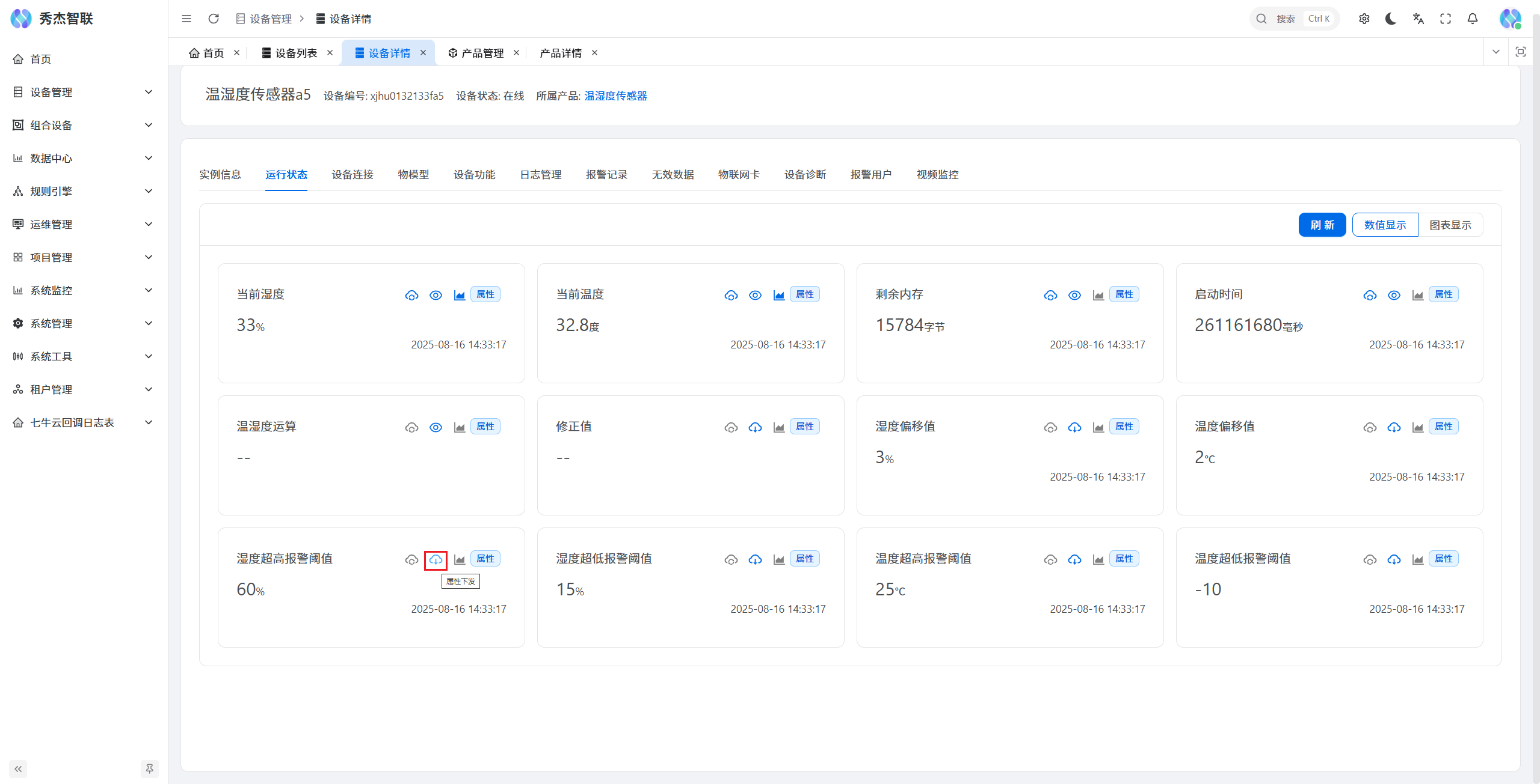 之后我们在设备详情页中点击 运行状态,在对应的属性卡片中点击第二个按钮 属性下发