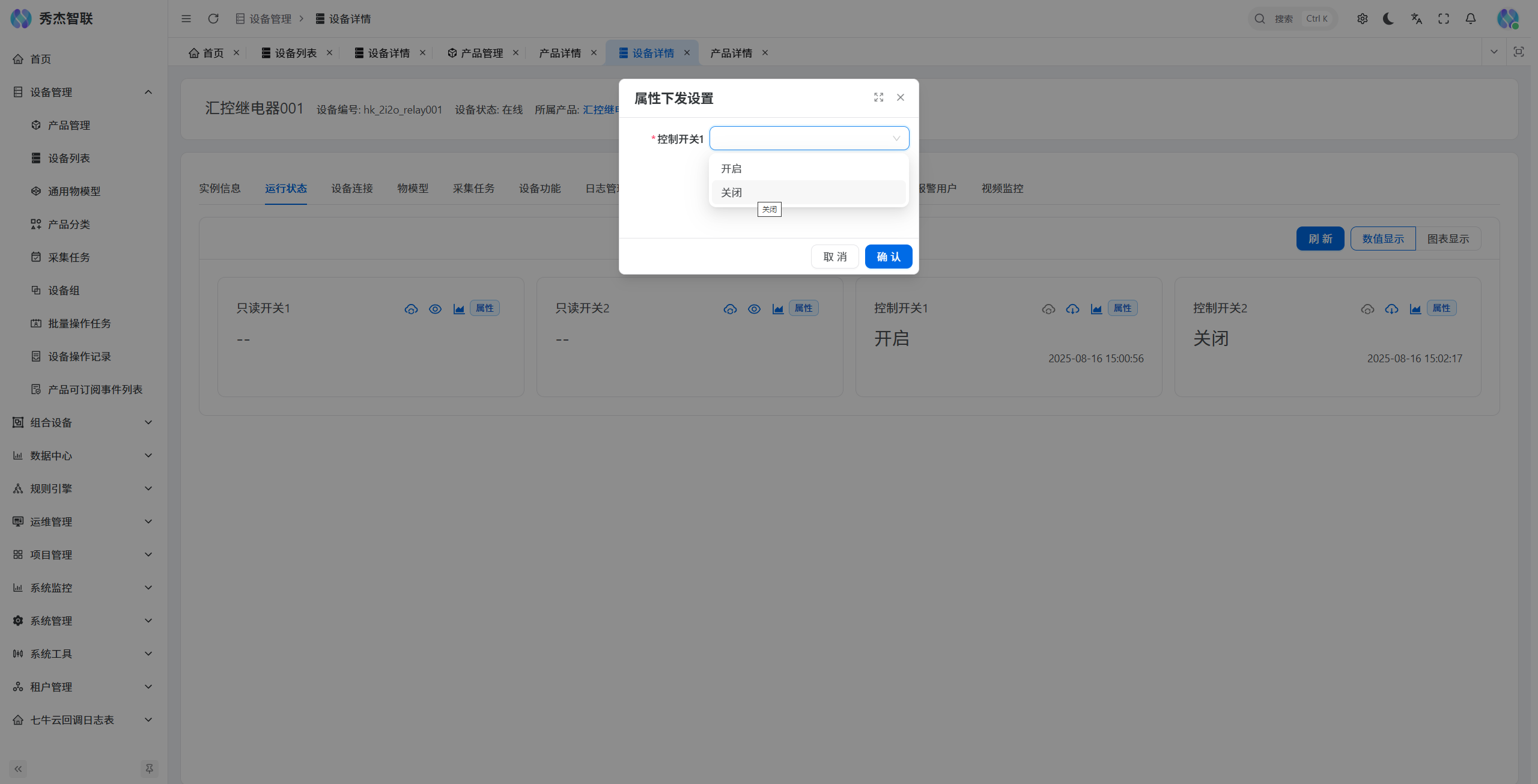 之后我们在设备管理 -> 设备列表-> 详情中打开 运行状态,找到控制开关类的属性卡片,点击第二个按钮下发属性,就可以对开关的状态进行控制了。