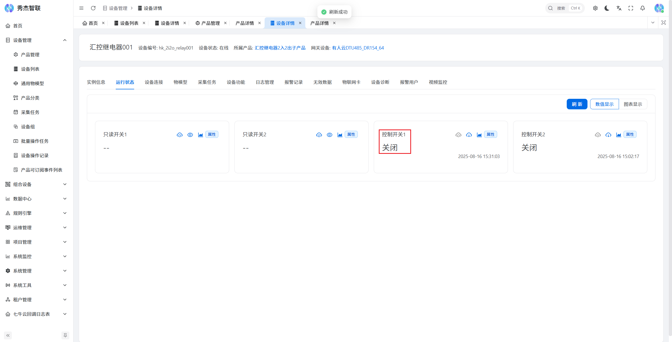 这里我们下发属性 关闭 给控制开关1 ,在点击 确认 按钮之后,会提示 下发指令成功,之后我们点击 刷新 按钮,可以看到控制开关1 的状态已经变为关闭了。