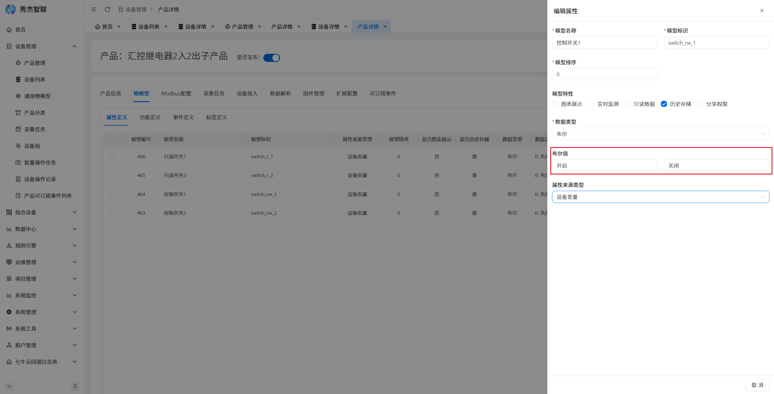 我们还可以下发开关属性数据给设备,比如:继电器类设备,可以设置数据类型为布尔,比如:开关属性数据为true,则继电器开启,为false则继电器关闭。