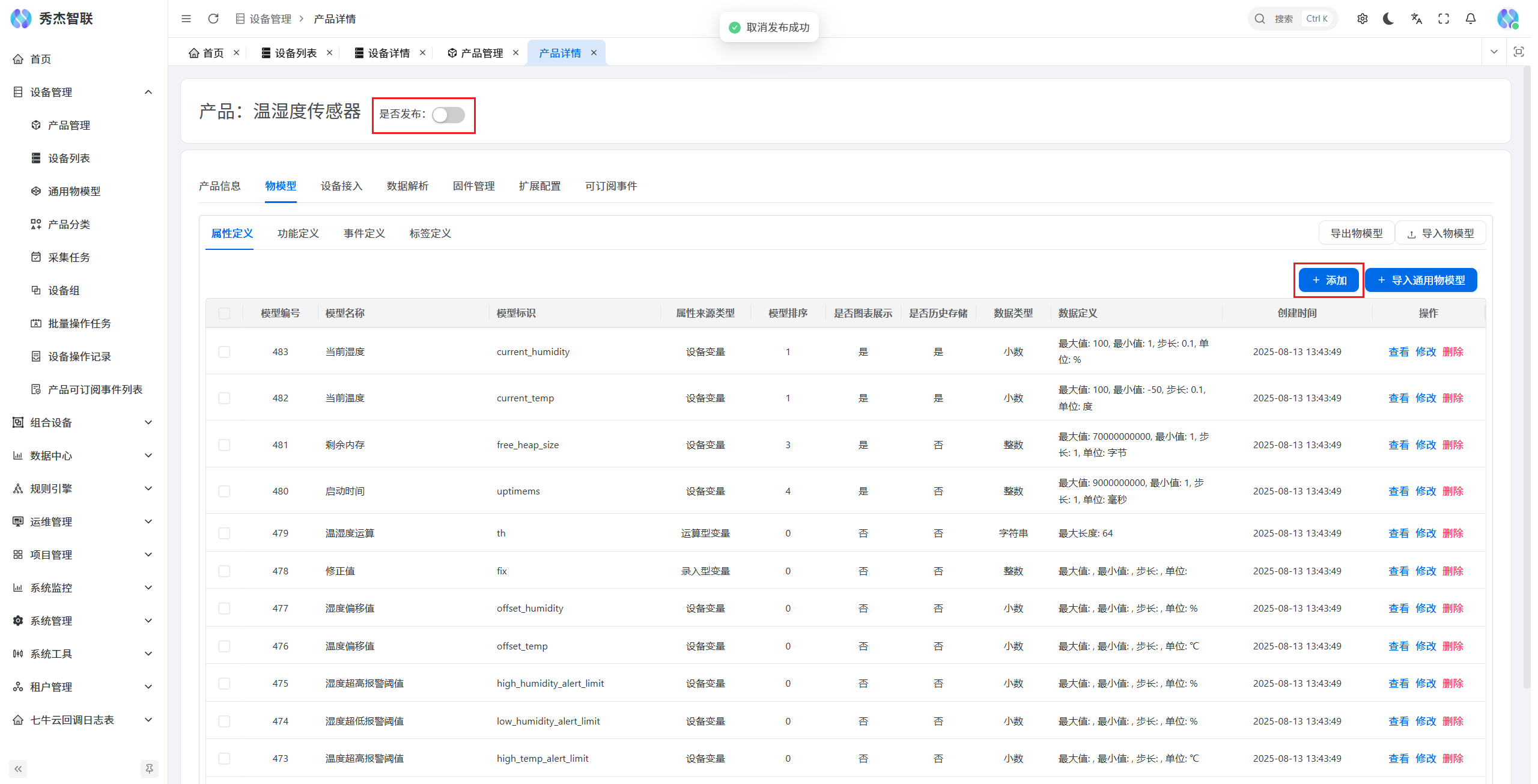 我们新增好属性数据后,点击 确认 按钮,属性数据就会保存成功。当配置完属性数据后,可以点击产品的 发布 按钮,将属性数据发布到平台。