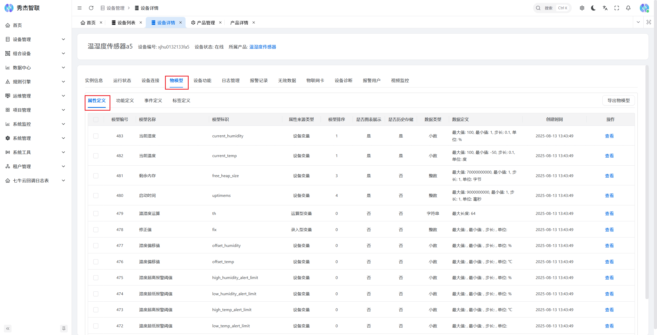 产品发布成功后,属性数据就可以在设备详情页中查看。我们找到 设备管理 -> 设备列表-> 详情,进入设备详情页,点击 物模型,就可以查看刚刚同步的属性数据。